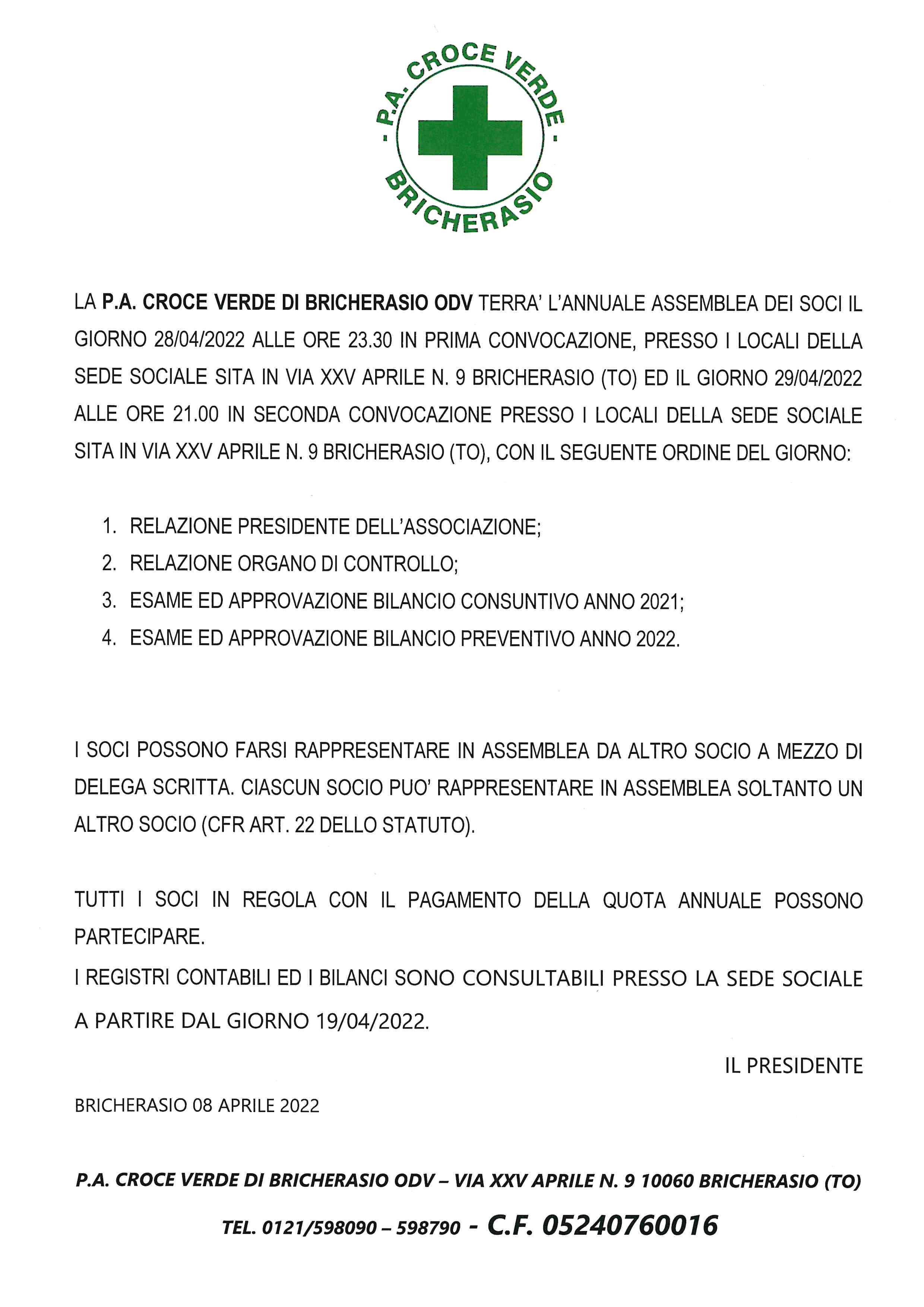 L’assemblea annuale dei soci della Croce Verde di Bricherasio è convocata per venerdì 29 aprile alle ore 21 della sede in Via XXV Aprile, 9 per discutere sul seguente ordine del giorno: Relazione del Presidente dell’Associazione Danilo Mensa, Relazione del Presidente del Consiglio Revisore dei Conti, Esame ed approvazione dei bilanci consuntivo del 2021 e preventivo dell’anno in corso, chiudono varie ed eventuali. Tutti i soci in regola con il pagamento della quota annuale sono gentilmente invitati a partecipare e si ricorda che i registri contabili ed i bilanci sono visionabili nella sede sociale a partire da martedì 19 aprile. I soci possono farsi rappresentare in assemblea tramite delega scritta, ciascun socio può rappresentarne uno. Si ricorda che la campagna tesseramenti dell'Associazione bricherasiese prosegue e con un piccolo contributo si aiuta ad assicurare un servizio indispensabile sul territorio ed a sostenere il volontariato, per qualsiasi informazione contattare la Croce Verde di Bricherasio al numero 0121/598090. L’Associazione ha sempre bisogno di forze fresche e spera di trovare tante persone giovani e meno giovani da affiancare agli attuali centotrenta volontari operativi. Per diventare volontario non sono necessarie doti o attitudini particolari, è sufficiente avere buona volontà, avere compiuto il diciottesimo anno di età, per gli autisti essere in possesso di patente di cat. B. ed è necessario compilare una domanda che può essere richiesta presso la segreteria della sede in Via XXV Aprile. A partire da maggio inoltre sono operativi otto volontari impiegati in tre progetti sociali e di emergenza attivati dalla Croce Verde bricherasiese. Inoltre si può sostenere l’Associazione bricherasiese destinando il 5x1000 della dichiarazione dei redditi utilizzando il codice fiscale 05240760016. Infine prosegue la raccolta di materiale sanitario e alimentare a favore della popolazione ucraina. Si possono conferire dalle ore 7 alle 20 nella sede di Via XXV Aprile cibi a lunga conservazione, medicinali, materiale sanitario e abbigliamento primaverile/estivo per adulti e bambini.