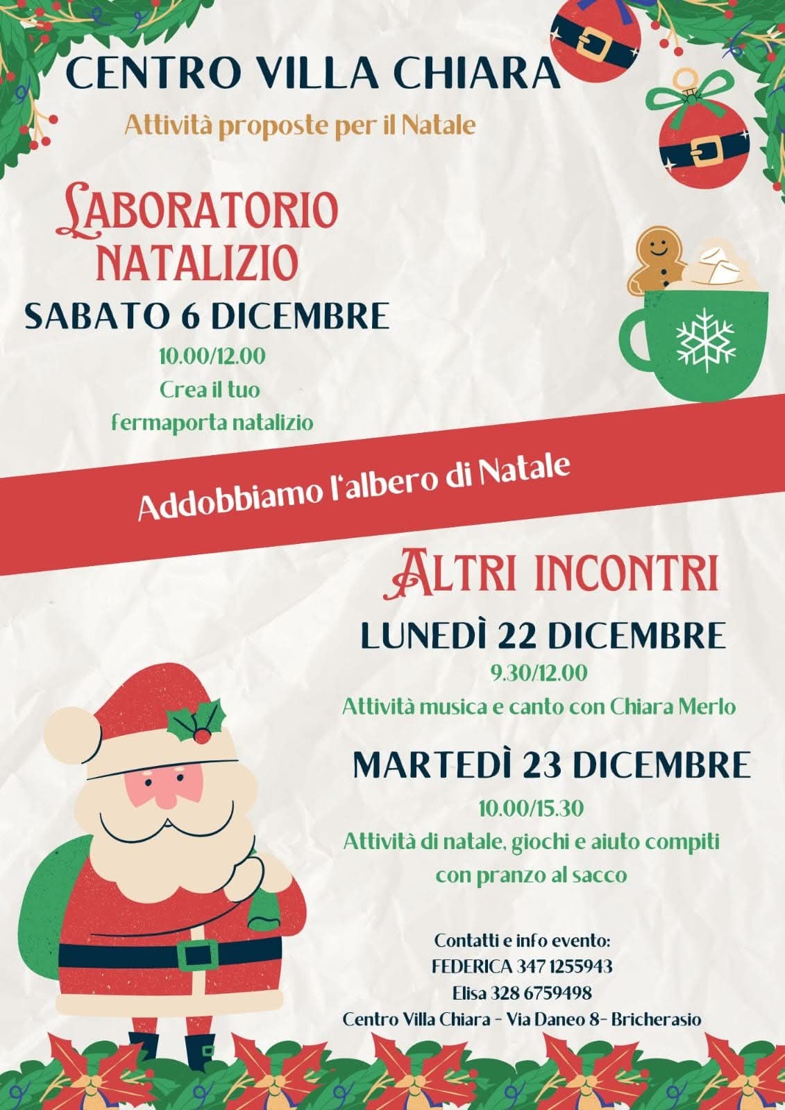 Lunedì 22 dicembre dalle ore 9,30 alle 12 al Centro Villa Chiara di Via Daneo 8 a Bricherasio si organizza, in occasione delle festività natalizie, l’attività di musIca e canto con Chiara Merlo. Martedì 23 dalle ore 10 alle 15,30 si svolgono attività di Natale, giochi e aiuto compiti con pranzo al sacco al coperto. Per contatti e per avere maggiori informazioni sugli eventi rivolgersi a Federica al 347 1255943 oppure ad Elisa al numero 328 6759498.