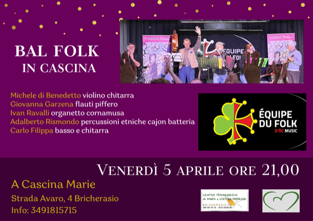 Il Centro Pedagogico di Danza e Cultura Popolare di Strada Avaro, 4 nella frazione di Cappella Merli a Bricherasio organizza per le ore 21 di venerdì 5 aprile l’evento “Bal folk in Cascina” con l'Equipe du folk, per fare festa e baldoria. L’Équipe sono un ensemble formato di cInque musicisti con un percorso ed una estrazione musicale eterogenea ma di alto livello, perfettamente amalgamati ed accomunati dalla stessa passione per il folk. I filoni musicali da cui i musicisti si isspirano sono di matrice occitana e per informazioni e prenotazioni chiamare Maria Baffert al numero 3491815715