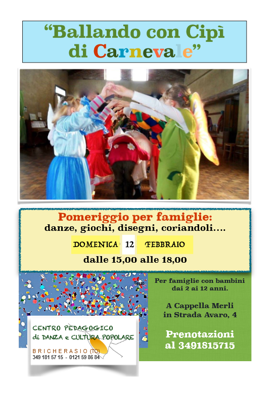 Il Centro Pedagogico di Danza e Cultura Popolare (Strada Avaro 4, frazione Cappella Merli) organizza, in occasione del Carnevale, per domenica 12 febbraio (inizio alle ore 15) un pomeriggio per famiglie con danze, giochi, disegni, coriandoli e tutto quello che serve per fare festa. Per prenotazioni telefonare al 349/1815715 oppure 0121/598684.