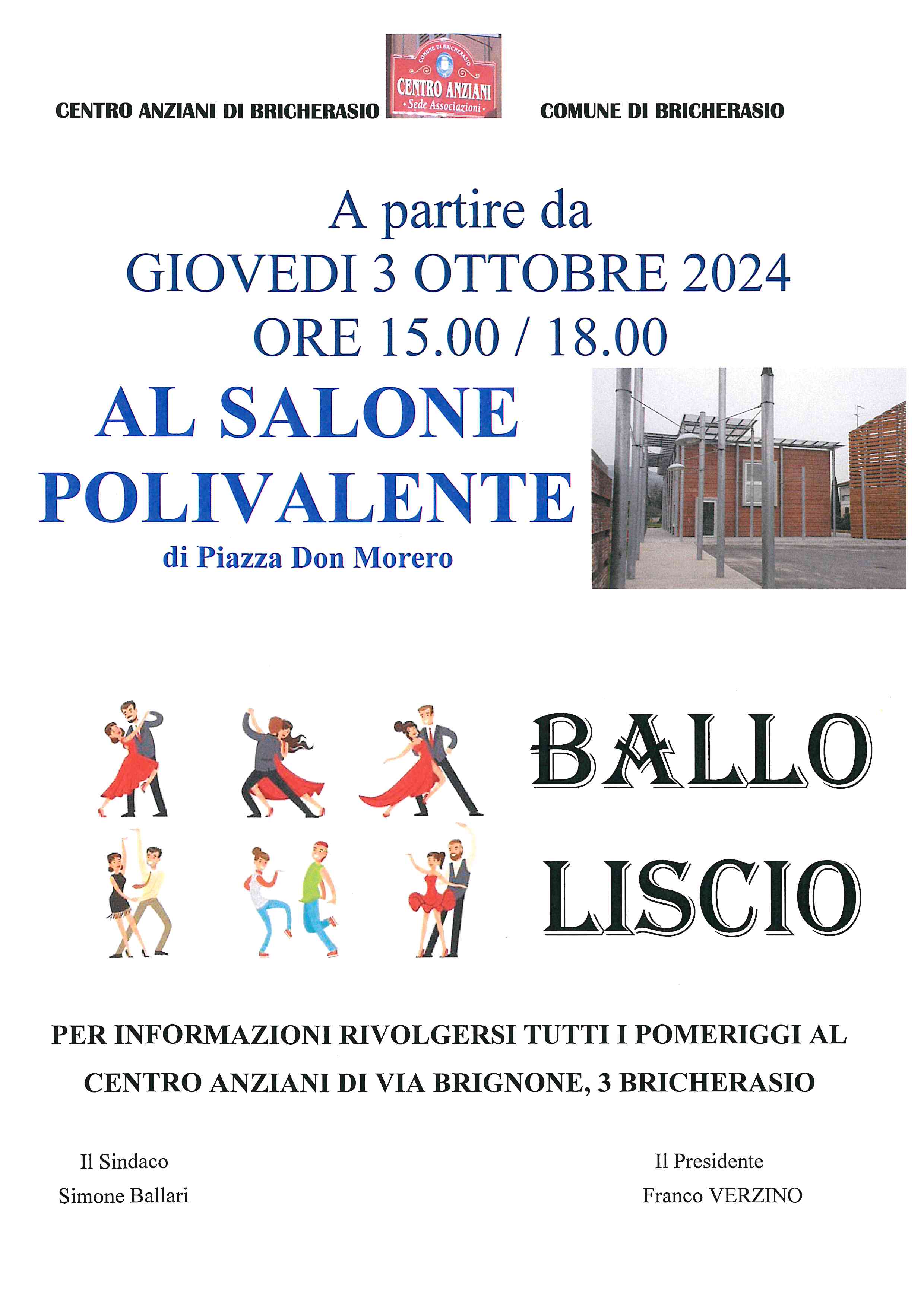 Il Centro Anziani di Bricherasio comunica che a partire da giovedì 3 ottobre riprendono i consueti giovedì pomeriggio con il ballo liscio al Salone Polivalente, di Piazza Don Morero, 2 dalle ore 15 alle 18. Per maggiori informazioni rivolgersi tutti i pomeriggi nella sede di Via Brignone, 3 dalle 15 alle 18