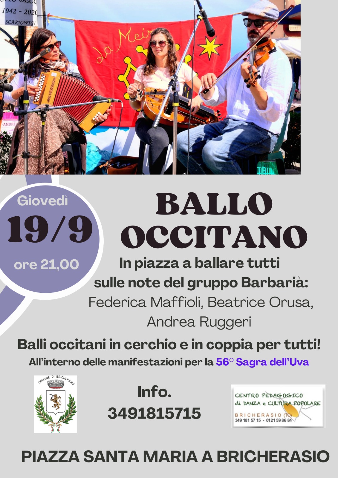 Giovedì 19 settembre il Centro Pedagogico di Danza e Cultura Popolare di Bricherasio organizza, nell’ambito della 56^ Sagra dell’Uva, una serata di ballo occitano in cerchio e in coppia per tutti. Il gruppo Barbaria, composto da Federica Maffioli, Beatrice Orusa e Andrea Ruggeri invita in Piazza Santa Maria a Bricherasio le persone a ballare all’aperto. Per maggiori informazioni chiamare Maria Baffert al numero 3491815715.