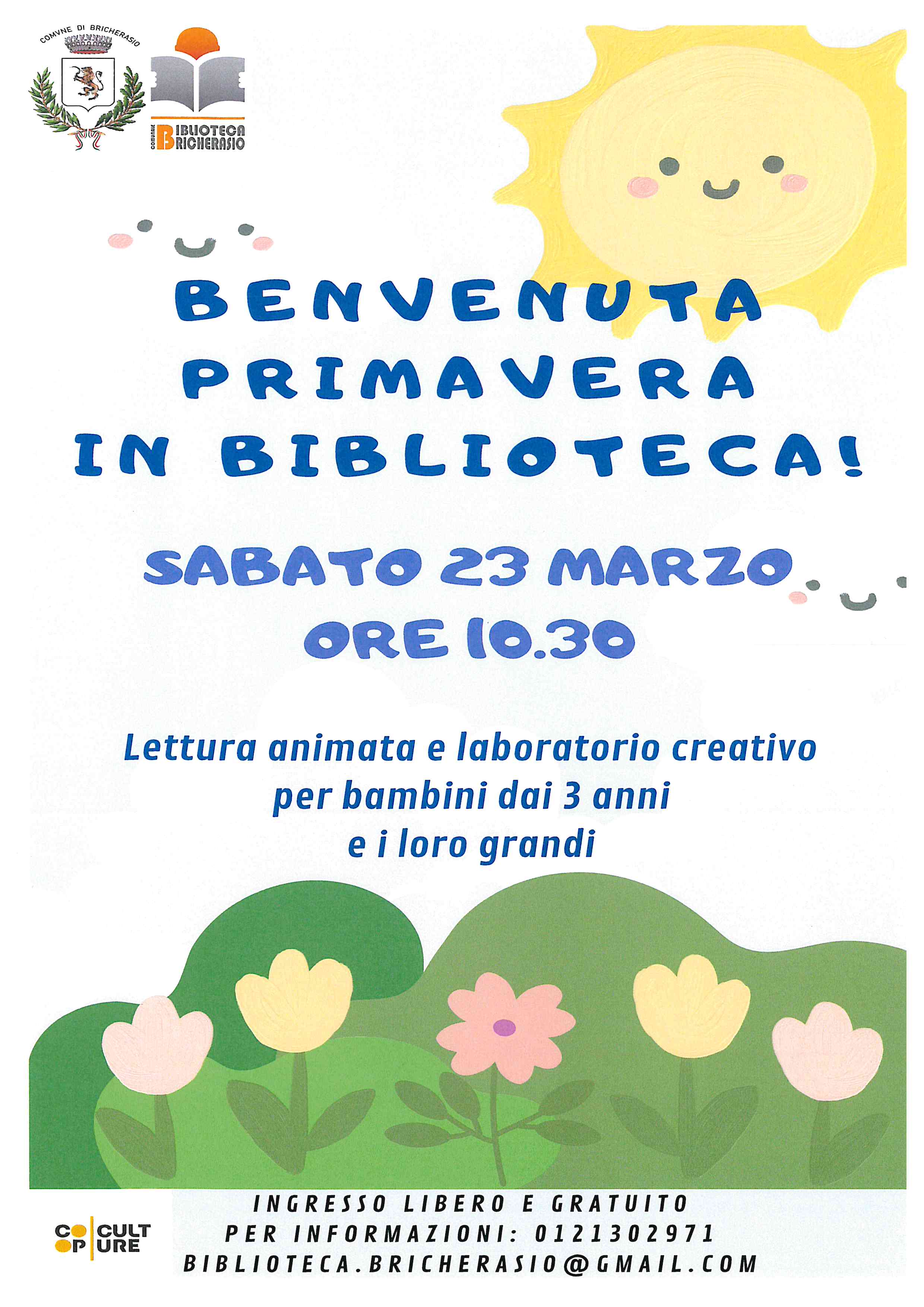 La Biblioteca Comunale di Bricherasio organizza per sabato 23 marzo "Benvenuta primavera", una mattinata con letture animate e laboratorio creativo per bambini e bambine dai 3 anni con i loro genitori, nonni ed amici. A partire dalle 10,30 la sala lettura di Via Vittorio Emanuele II, 79/B accoglie i partecipanti per dare il gradito saluto alla nuova stagione. Ingresso gratuito e per maggiori informazioni scrivere una mail a biblioteca.bricherasio@gmail.com oppure telefonare in orario di apertura (dal lunedì al venerdì dalle ore 16 alle 18 e il sabato dalle 10 alle 12) al numero 0121302971. L’iniziativa si può consultare anche sulla pagina Facebook della biblioteca bricherasiese.