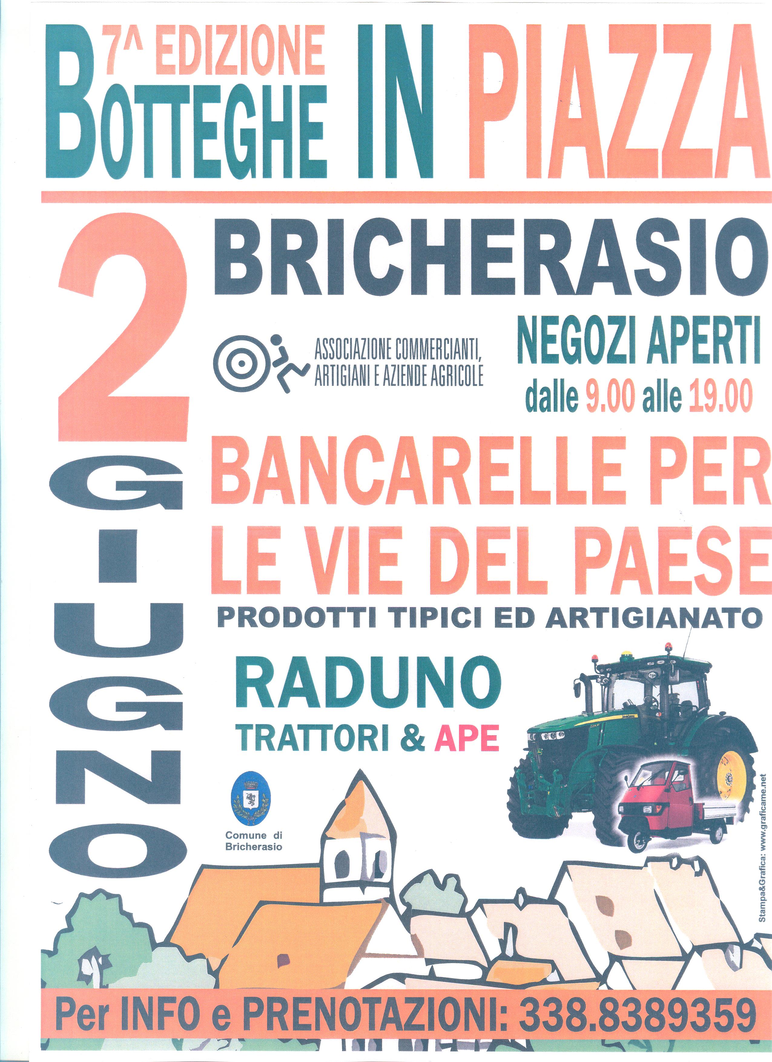 L'Associazione Commercianti artigiani e aziende agricole di Bricherasio con il patrocinio del Comune organizza per lunedì 2 giugno la settima edizione della rassegna denominata “Botteghe in piazza” che prevede l’apertura dei negozi del paese dalle ore 9.00 alle 19.00, il raduno di trattori e di ape, il mercato con bancarelle per le vie del paese di hobbisti, di artisti, di articoli commerciali e prodotti tipici e sarà possibile scoprire ed apprezzare le capacità degli artigiani, degli ambulanti e dei commercianti, grazie a degustazioni di piatti tipici, all'esposizione di antichi oggetti ed utensili da lavoro e all'opportunità di acquistare vari prodotti e si sottolinea come le botteghe, in particolar modo quelle artigiane, rappresentino una ricchezza non solo commerciale, ma anche culturale. Ci si potrà imbattere in opere e manufatti creati da maestri artigiani e osservare alcune lavorazioni dal vivo. “Botteghe in piazza” è una vera passerella di vecchi mestieri, nobili arti come le lavorazioni in ferro, legno, paglia, vetro, ceramica e tessuto. L'Associazione di Bricherasio, con lo scopo sia di tutelare i suoi componenti, ma soprattutto di fare un qualcosa per il proprio paese con commercianti, artigiani e agricoltori facendo conoscere con varie iniziative i loro prodotti e il proprio lavoro, per far si che Bricherasio non venga emarginato dalla sempre più maggior concorrenza. Nell’attuale momento di crisi, iniziative come questa sono importanti perché è necessario rilanciare positivamente l’immagine della formazione tecnica specializzata, del lavoro manuale e del rafforzamento delle competenze all’interno dei luoghi di lavoro. Una scelta questa percorribile con le varie forme di apprendistato che si sono avviate in questi anni, e che hanno responsabilizzato sempre di più i datori di lavoro nella loro funzione di formatori. Per informazioni e prenotazioni telefonare al 338/8389359