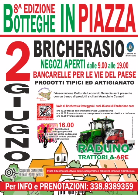 L'Associazione Commercianti artigiani e aziende agricole di Bricherasio organizza per martedì 2 giugno l’ottava rassegna denominata “Botteghe in piazza” che prevede l’apertura dei negozi del paese dalle ore 9.00 alle 19.00, il raduno di trattori e di ape, la pesca di beneficenza a favore della scuola primaria e della biblioteca bricherasiesi, il banco di prodotti siciliani dell’Associazione Leonardo Sciascia, il mercato con bancarelle per le vie del paese di hobbisti, di artisti, di articoli commerciali, di artigianato e di prodotti tipici con degustazione di prodotti enogastronomici del Paniere e delle valli e sarà possibile scoprire ed apprezzare le capacità degli artigiani, degli ambulanti e dei commercianti, grazie a degustazioni di piatti tipici, all'esposizione di antichi oggetti ed utensili da lavoro e all'opportunità di acquistare vari prodotti. Dalle ore 16 balli occitani con il gruppo Airis a cura del CIPI. Botteghe in piazza è una vera passerella di vecchi mestieri, nobili arti come le lavorazioni in ferro, legno, paglia, vetro, ceramica e tessuto e ci si potrà imbattere in opere e manufatti creati da maestri artigiani e osservare alcune lavorazioni dal vivo.. Il Piemonte, è una delle regioni italiane più ricche di botteghe storiche: pasticcerie, caffé, farmacie, rivendite tabacchi, librerie, cappellerie... Non c’è che l’imbarazzo della scelta. Tra una cioccolata con panna e locali che tengono conto, almeno in parte, della produzione locale a Bricherasio si dedica una giornata nel ricordo dei vecchi mestieri. Nell’attuale momento di crisi, iniziative come questa sono importanti perché è necessario rilanciare positivamente l’immagine della formazione tecnica specializzata, del lavoro manuale e del rafforzamento delle competenze all’interno dei luoghi di lavoro. Per informazioni e prenotazioni telefonare al 338/8389359.