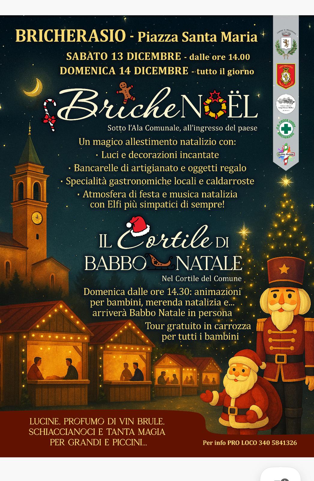 La Pro Loco di Bricherasio in collaborazione con la Croce Verde, il Gruppo Giovani ed il Circolo Bollea, con il patrocinio del Comune di Bricherasio, organizza da sabato 13 dicembre alle ore 14.00 fino a domenica 14 sera in Piazza Santa Maria la 1° edizione della manifestazione natalizia "Briche Noel".