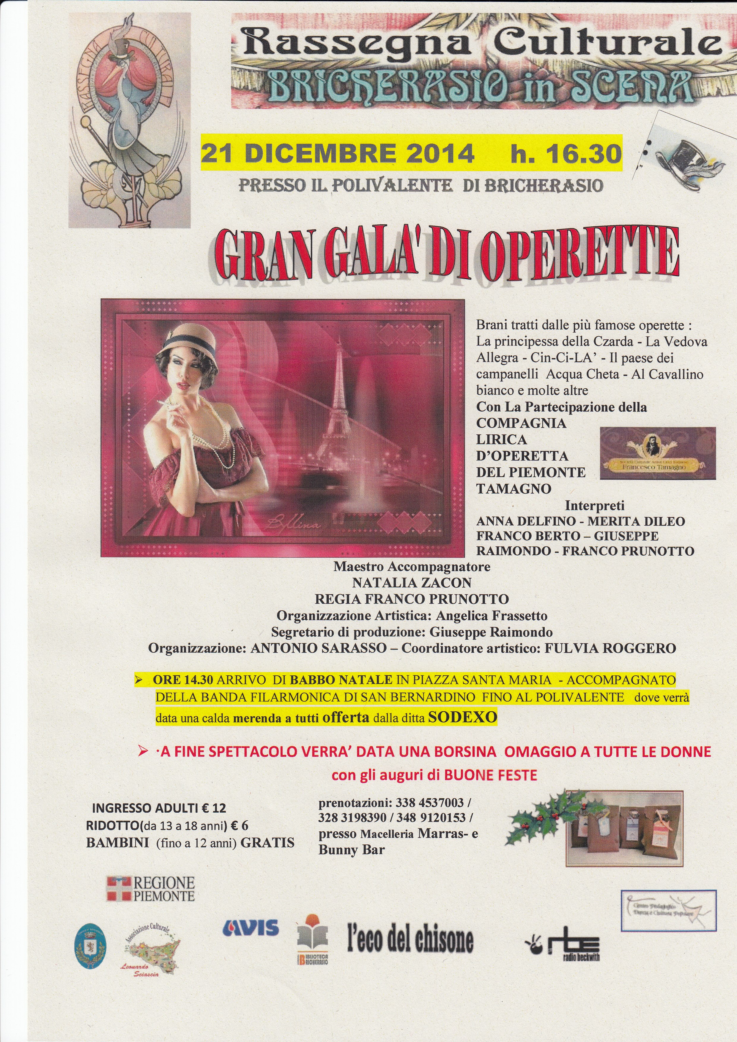 Gran galà di operette per il terzo appuntamento nell'ambito della rassegna "Bricherasio in scena" all'interno della 16 edizione del Natale a Bricherasio. Questo appuntamento è veramente particolare, sono dei grandi professionisti del settore, è la Compagnia degli artisti lirici torinesi: associazione culturale "Francesco Tamagno" . La programmazione è prevista alle ore 16.30 presso il Polivalente di Bricherasio preceduta dall'arrivo di Babbo Natale, dalle musiche della Filarmonica San Bernardino di Bricherasio e dalla merenda offerta a tutti dalla Sodexo. Sarà un evento particolare sia per lo spettacolo che per il momento: arrivo di Babbo Natale, Banda Filarmonica di San Bernardino, merenda con cioccolata clda per tutti offerta dalla Sodexo e dalla mia associazione, spettacolo di operette ed omaggio a tutte le donne di una borsina regalo ......