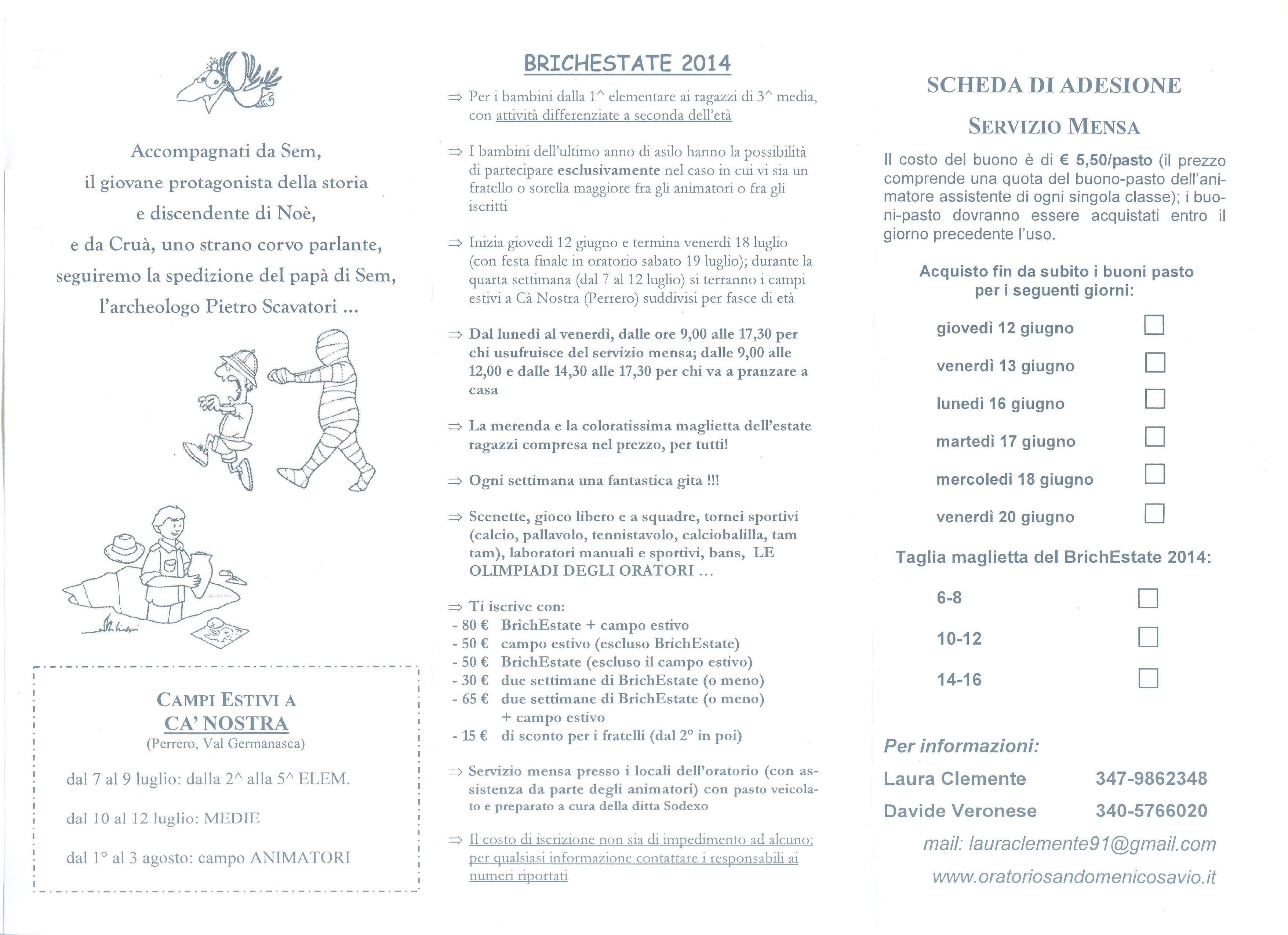 La Parrocchia di Santa Maria e l’Oratorio San Domenico Savio di Bricherasio, in collaborazione con il Comune, presentano “Brichestate 2014” con la tradizione di 16 edizioni consecutive. Brichestate impegna i partecipanti da giovedì 12 giugno a venerdì 18 luglio con festa finale all’Oratorio sabato 19 luglio. Gli orari sono da lunedì a venerdì dalle ore 9.00 alle 17.30 per chi usufruisce del servizio mensa presso l’oratorio e dalle ore 9.00 alle 12.00 e dalle 14.30 alle 17.30 per chi torna a casa per il pranzo. L’attività si svolge presso i campi e i locali dell’oratorio S. Domenico Savio di Via del Portone e il filo conduttore dell’Estate Ragazzi è “Che diluvio ragazzi!!!”, accompagnati da Sem il giovane protagonista della storia e discendente di Noè, e da Cruà uno strano corvo parlante e si seguirà la spedizione del papà di Sem, l’archeologo Pietro Scavatori che farà da contorno all’incredibile mese di Brichestate. Sono previsti ogni giorno tornei sportivi (calcio, pallavolo, tennistavolo e calciobalilla), attività teatrali, di danza e di laboratorio manuale e sportivo, gioco libero e a squadre, ogni settimana una fantastica gita e le incredibili Olimpiadi degli Oratori. Sarà possibile usufruire del servizio della mensa scolastica con l’assistenza e il servizio da parte degli animatori. Viene richiesto un contributo spese che varia dagli 80 € per coloro che partecipano sia a Brichestate che al campo estivo di Cà Nostra agli inizi di luglio, ai 50 euro per il solo campo estivo e per l’intero mese di attività di Brichestate e 15 € di sconto-Famiglia per i fratelli dal 2° in poi: Agevolazioni anche per chi sarà presente due settimane o meno: 30 € ma si sottolinea che il costo di iscrizione non deveessere da impedimento ad alcuno. Per qualsiasi delucidazione rivolgersi ai responsabili ovvero Davide 340-5766020 oppure Laura 347-9862348 mail: lauraclemente91@gmail.com e ulteriori informazioni anche sul sito web www.oratoriosandomenicosavio.it