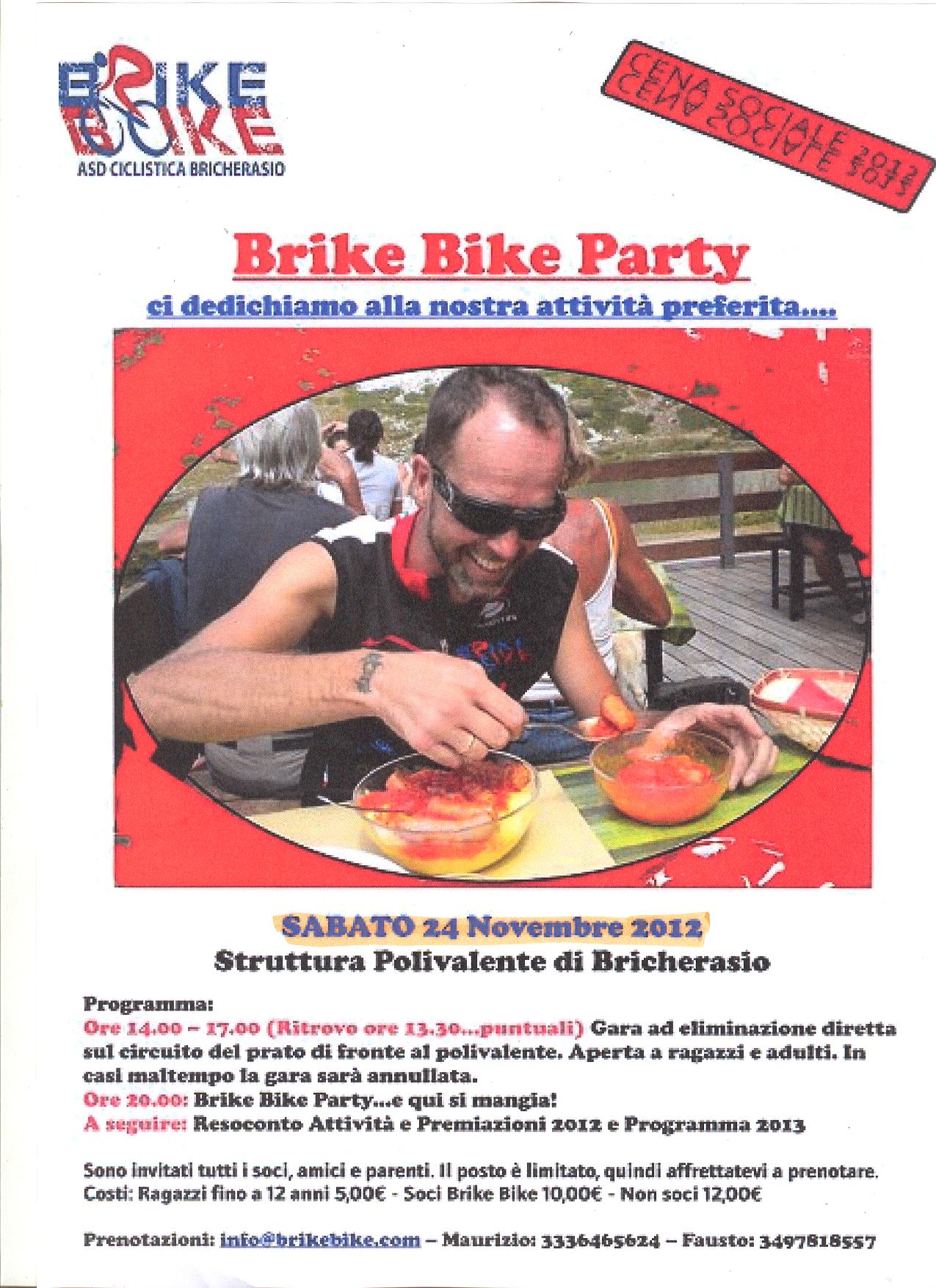 L’Associazione Ciclistica Brike Bike di Bricherasio organizza per sabato 24 novembre la cena di fine attività annuale presso il Salone Polivalente di Via Vittorio Emanuele II a Bricherasio con ritrovo alle ore 13.30 sul posto per disputare una gara ad eliminazione diretta sul circuito ricavato nel prato di fronte al Palajunior. La sfida è aperta a tutti, adulti, ragazzi e bambini che vogliono provare l’emozione adrenalinica della bmx. Alle 20 comincia il party a cui seguirà il resoconto dell’attività del 2012 con relative premiazioni e si illustrerà il programma del 2013. Sono invitati i soci, amici, parenti e simpatizzanti a prezzi modici e visto che i posti sono limitati si invitano gli interessati a prenotare da Maurizio al 333/6465624 o da Fausto al 349/7818557.