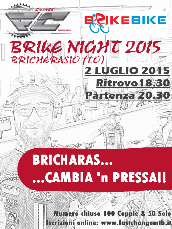 La Società Ciclistica Brike Bike di Bricherasio con il patrocinio dell’Assessorato allo Sport del Comune di Bricherasio organizza per giovedì 2 luglio la quarta edizione della “Brike night”, corsa serale in mountain bike, aperto a 100 coppie o, per i primi 50 iscritti, in solitaria su di un circuito semi-cittadino di 2,5 km, con il mitico passaggio nella pista bmx di Via Bellville. La gara fa parte di un circuito di gare preserali organizzate da Fast Change dove passione, esperienza e competenza da sempre distinguono l’Associazione incontrando altre realtà altrettanto attive e volenterose del nostro meraviglioso territorio nasce il mtb contest camp un vero e proprio "motore" di eventi sportivi con il compito di organizzare gare inconfondibili come il "mitico" Fast Change, espandendolo in altre competizioni legate al mondo della MTB, sia regionali che a livello nazionale. Ritrovo dalle ore 18,30 in Piazza Santa Maria e dopo il briefing delle 20 la partenza fissata alle 20,30 a cui seguirà la premiazione e ristoro finale per gli atleti. Alla gara sono ammessi tutti i tesserati F.C.I. e tutte le categorie esclusi i giovanissimi. Alla gara sono ammessi tutti i tesserati F.C.I. ed Enti della Consulta. Si ricorda che possono partecipare alla notturna anche gli atleti non tesserati che, presentandosi con certificato medico agonistico. Le adesioni si ricevono tramite bonifico bancario sull’IBAN: IT72U0848730751000310100275 della Banca di Cherasco, Agenzia di Pinerolo con causale del versamento: Brike Night 2014 e indicando cognome e nome. Ci si può iscrivere il giorno della gara dalle 18 alle 19,30, e si suggerisce l’uso di una luce anteriore, con tanto buon senso, ed è obbligatorio l’uso del casco. Per iscriversi online utilizzare il sito www.fastchangemtb.it e per maggiori informazioni e su facebook cercare fastchangemtb su o telefonando a Maurizio al numero 333/6465624.