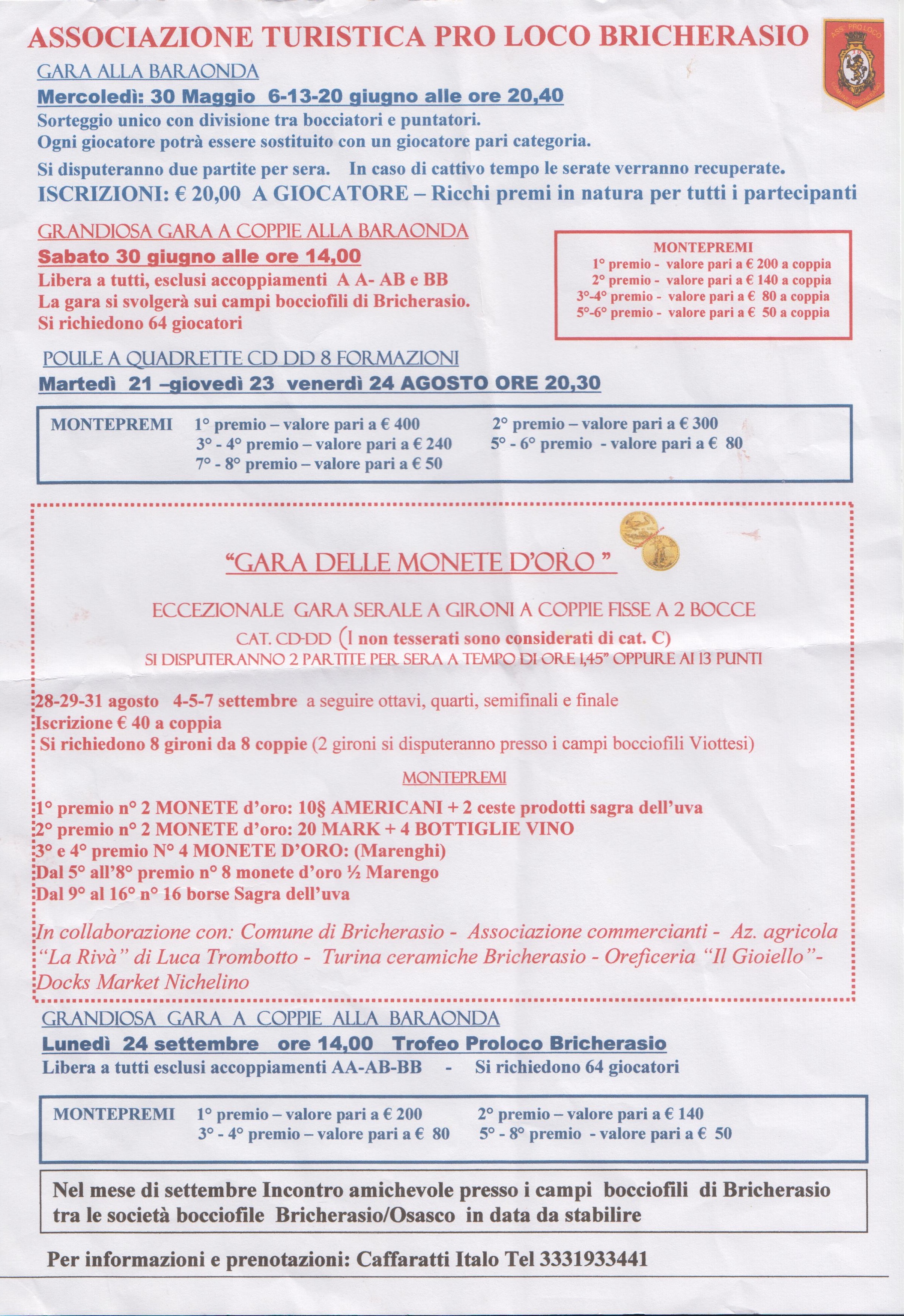 L’Associazione Turistica Pro Loco di Bricherasio nel proprio calendario delle gare alle bocce del 2018 sui campi tracciati di Piazza Santa Maria, 11 ha inserito una poule a quaterne CD-DD con otto formazioni che prosegue giovedì 23 e venerdì 24 agosto con inizio alle ore 20,30. Il primo premio è di valore pari a 400 €, il secondo di 300 €, poi a seguire i terzi e quarti vincono 240 €, il quinto e sesto posto si aggiudicano 80 € e le squadre che arrivano settime ed ottave vengono ricompensate con 50 €. All'interno della 50^ Sagra dell'Uva bricherasiese la Pro Loco ha incluso la prima edizione della "Gara a bocce delle monete d'oro", eccezionale sfida serale a gironi a coppie fisse a 2 bocce (cat. CD-DD) ai campi bocciofili comunali di Piazza Santa Maria che parte martedì 28 agosto alle 20.30. Le partite proseguono mercoledì 29, venerdì 31 agosto e la settimana successiva martedì 4, mercoledì 5 e venerdì 7 settembre. Il calendario di bocce della Sagra dell'Uva si chiude lunedì 24 settembre, dalle ore 14, con il classico Trofeo Pro Loco di Bricherasio, grandiosa gara a coppie alla baraonda libere a tutti, esclusi accoppiamenti AA, AB e BB con montepremi in denaro e si richiedono 64 giocatori. Per maggiori informazioni rivolgersi a Italo Caffaratti al 333/1933441.