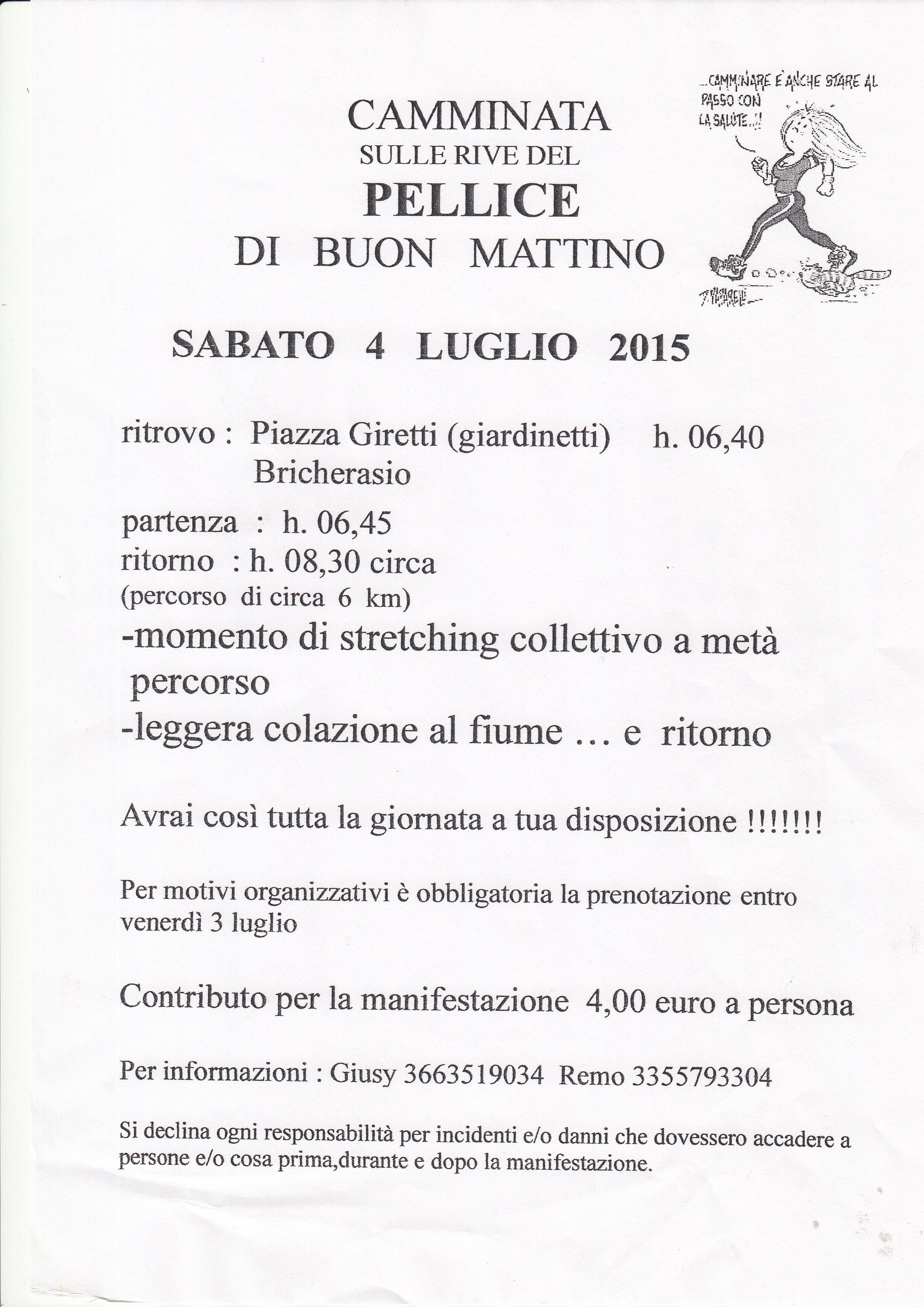 L’Azienda Agricola “Turismo rurale” di Blanc Tiziana organizza per sabato 4 luglio a Bricherasio una camminata sulle rive del Pellice di buon mattino. Il ritrovo ai giardinetti di Piazza Giretti a Bricherasio è fissato per le ore 6,40, la partenza cinque minuti dopo ed il ritorno previsto per le 8,30. A metà percorso momento di stretching collettivo e leggera colazione al fiume. Per motivi organizzativi è obbligatoria la prenotazione entro venerdì 3 luglio. Il contributo richiesto è di € 4 a persona. Informazioni e prenotazioni da Giusy al 366/3519034 e da Remo al 335/5793304. Si consiglia di munirsi di un abbigliamento consono, calzature sportive e dei bastoncini.