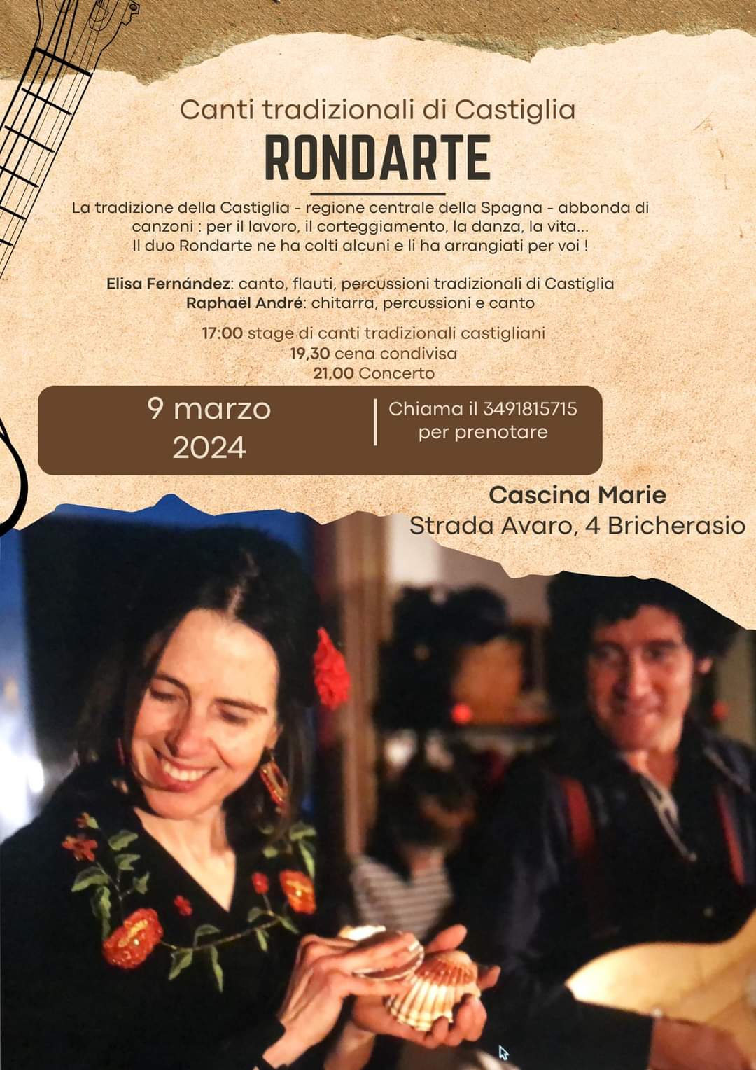 Sabato 9 marzo a Cascina Marie in Strada Avaro, 4 nella frazione di Cappella Merli a Bricherasio giornata dedicata ai canti tradizionali della CastIglia, con il duo Rondarte. La tradizione della regione centrale della Spagna abbonda di canzoni, per il lavoro, per il corteggiamento, per la danza e per la vita. La coppia di musicisti Elisa Fernàndez dedita al canto, ai flauti e alle percussioni tradizionali di Castiglia e Raphael André specializzato in chitarra, percussioni e canto ha raccolto alcuni brani arrangiandoli per gli appassionati. Dalle ore 17 si parte con lo stage, 19,30 la cena condivisa e alle 21 inizia il concerto. Per informazioni e prenotazioni chiamare Maria Baffert al numero 3491815715.