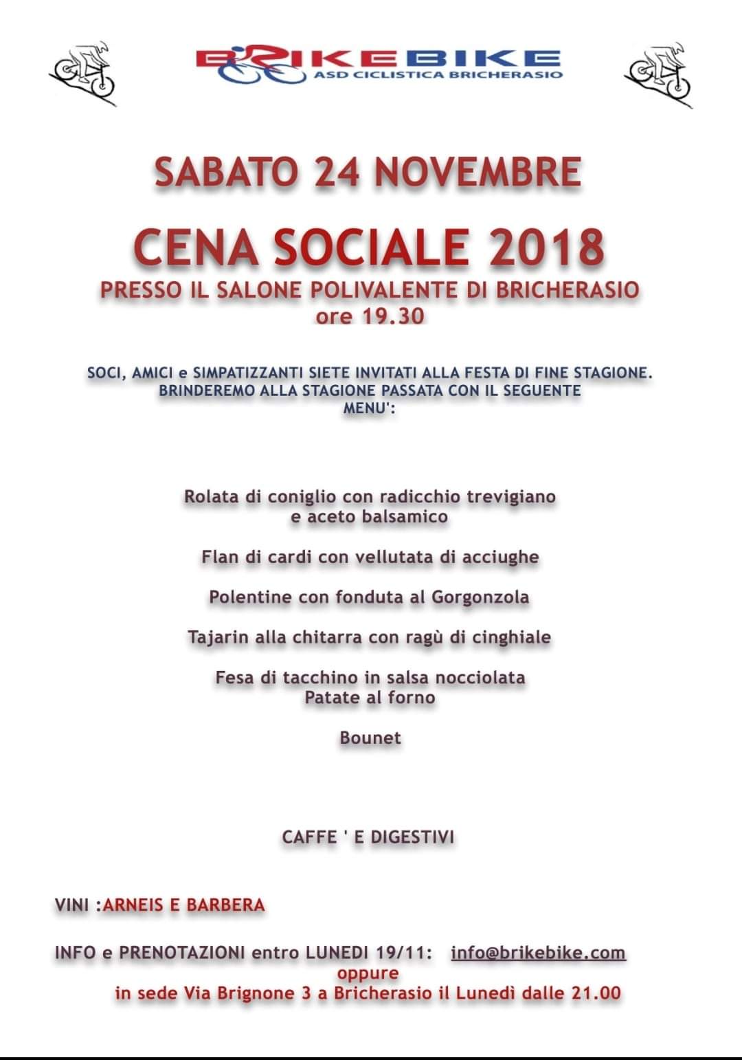 L’Associazione Ciclistica Brike Bike di Bricherasio si ritrova come ogni anno per i saluti di fine stagione e con l’aumento della famiglia per poter accogliere soci, atleti simpatizzanti e chiunque vuole unirsi alla festa, organizza per sabato 24 novembre alle ore 19,30 la cena di fine attività annuale al Salone Polivalente di Piazza Don Morero a Bricherasio. Si invitano gli interessati a prenotare entro lunedì 19 novembre alla sede del Brike Bike in Via Brignone, 3 il lunedì sera. Per maggiori informazioni rivolgersi a Maurizio al 333/6465624.