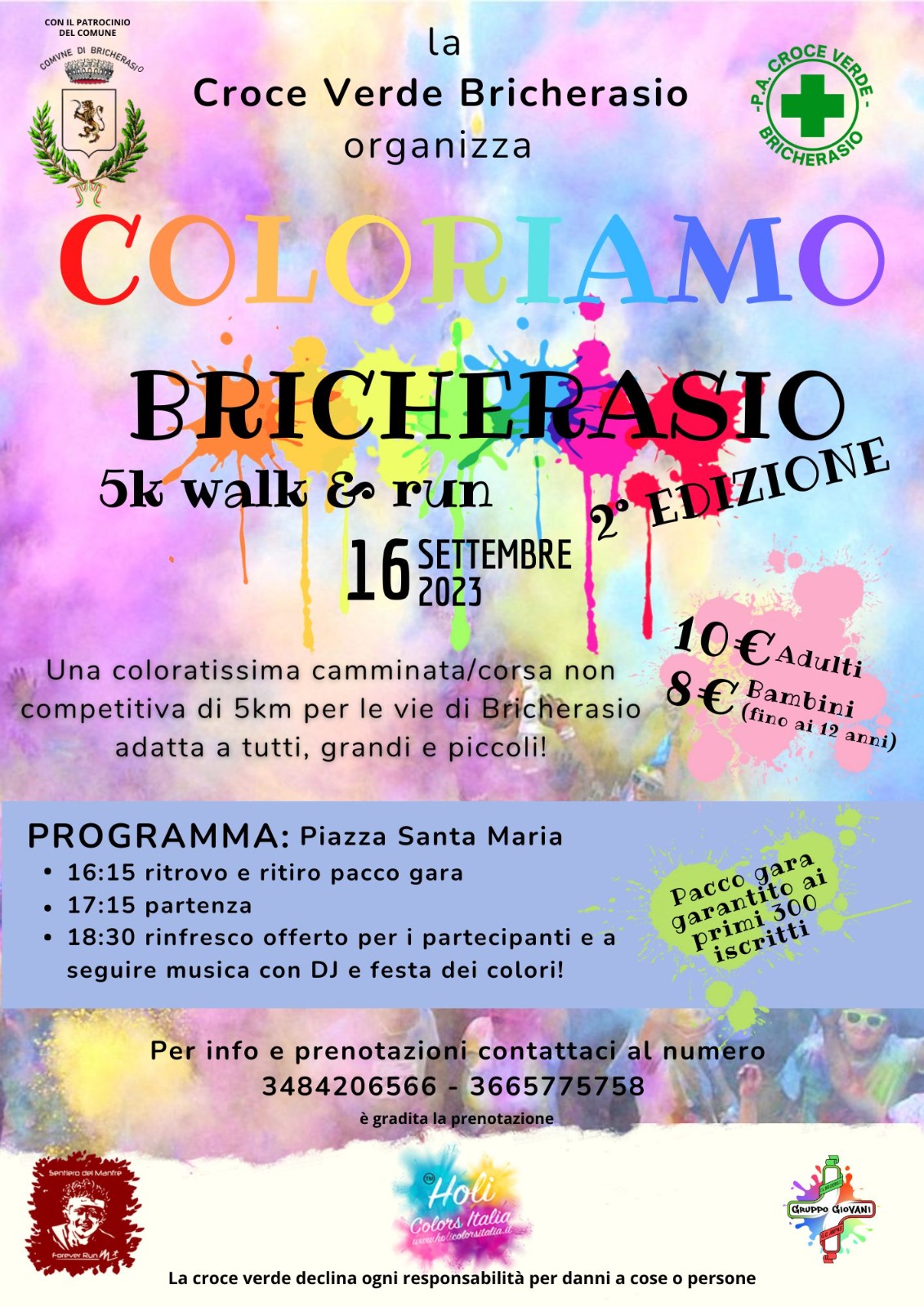 La Croce Verde di Bricherasio fa' il proprio ingresso nel calendario eventi sabato 16 con l'organizzazione con il supporto tecnico dell'Associazione "Sentiero del Manfre" della seconda edizione di "Coloriamo Bricherasio", una camminata non competitiva di 5 km per le vie del paese adatta sia agli adulti sia ai bambini. Dopo il ritrovo alle 16,15 in Piazza Santa Maria per il ritiro del pacco gara, garantito ai primi trecento iscritti, alle 17,15 la partenza del colorato gruppo e al termine il rinfresco offerto ai partecipanti e, a seguire, musica con dj e festa dei colori. Il costo di partecipazione e' di 10 euro per gli adulti e 8 € per i bimbi. Per informazioni e prenotazioni contattare il 348/4206566 oppure il numero 366/5775758.