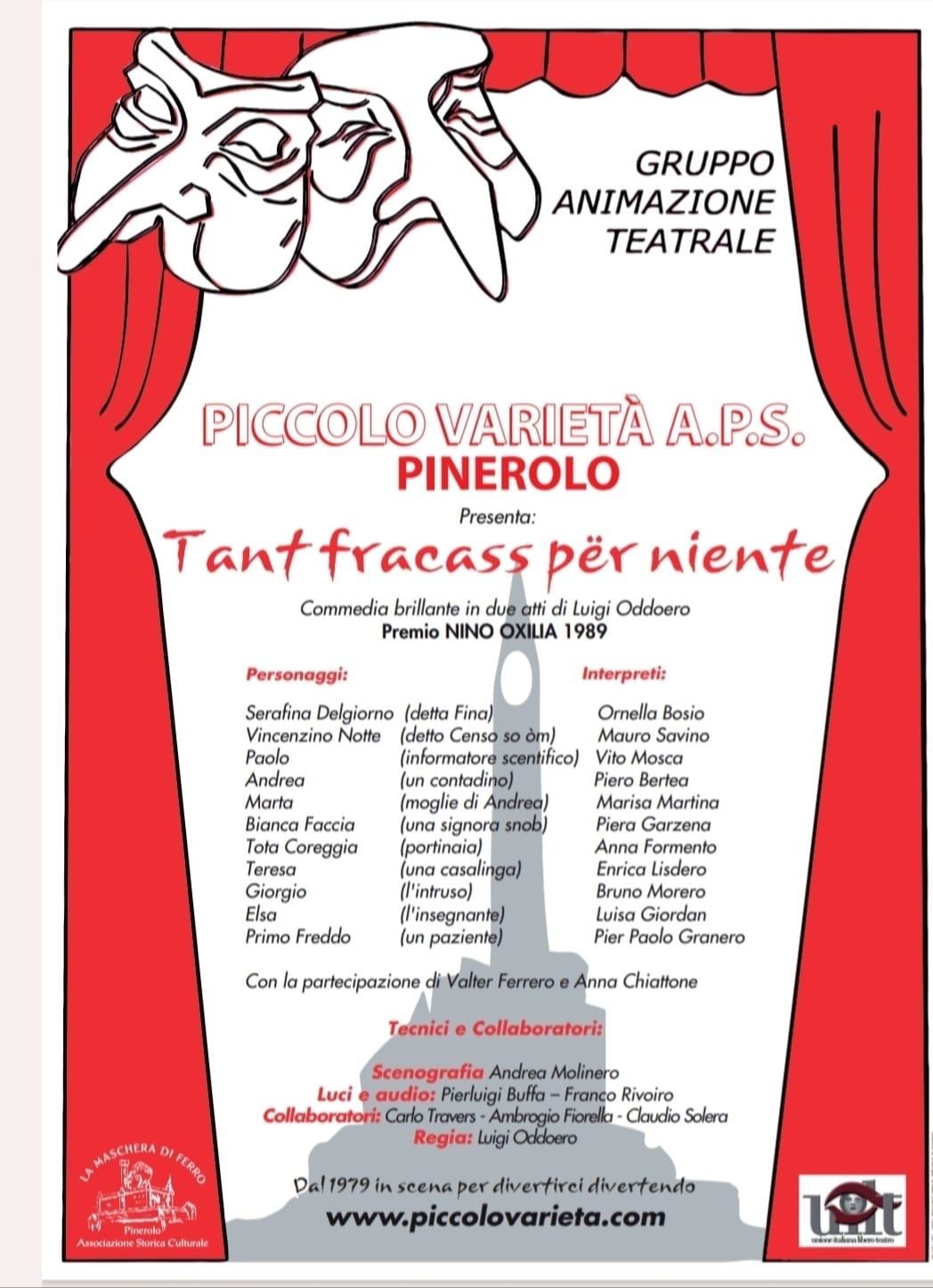 Altro irrinunciabile appuntamento è la commedia dialettale di mercoledì 13 alle ore 21 al Salone Polivalente. Torna, come ogni anno, il Piccolo Varietà di Pinerolo con gli attori pluripremiati di Luigi Oddoero che rappresentano Tant fracass per niente, commedia dialettale brillante in due atti con alcuni bricherasiesi protagonisti. Il lavoro dell’equipe teatrale ha vinto il Premio Nino Oxilia e vede la partecipazione di Valter Ferrero e Anna Chiattone. La parola d'ordine del Piccolo Varietà è divertirci divertendo e racchiude tutta la vocazione rappresentata nelle commedie in lingua piemontese in oltre quaranta anni sul palcoscenico