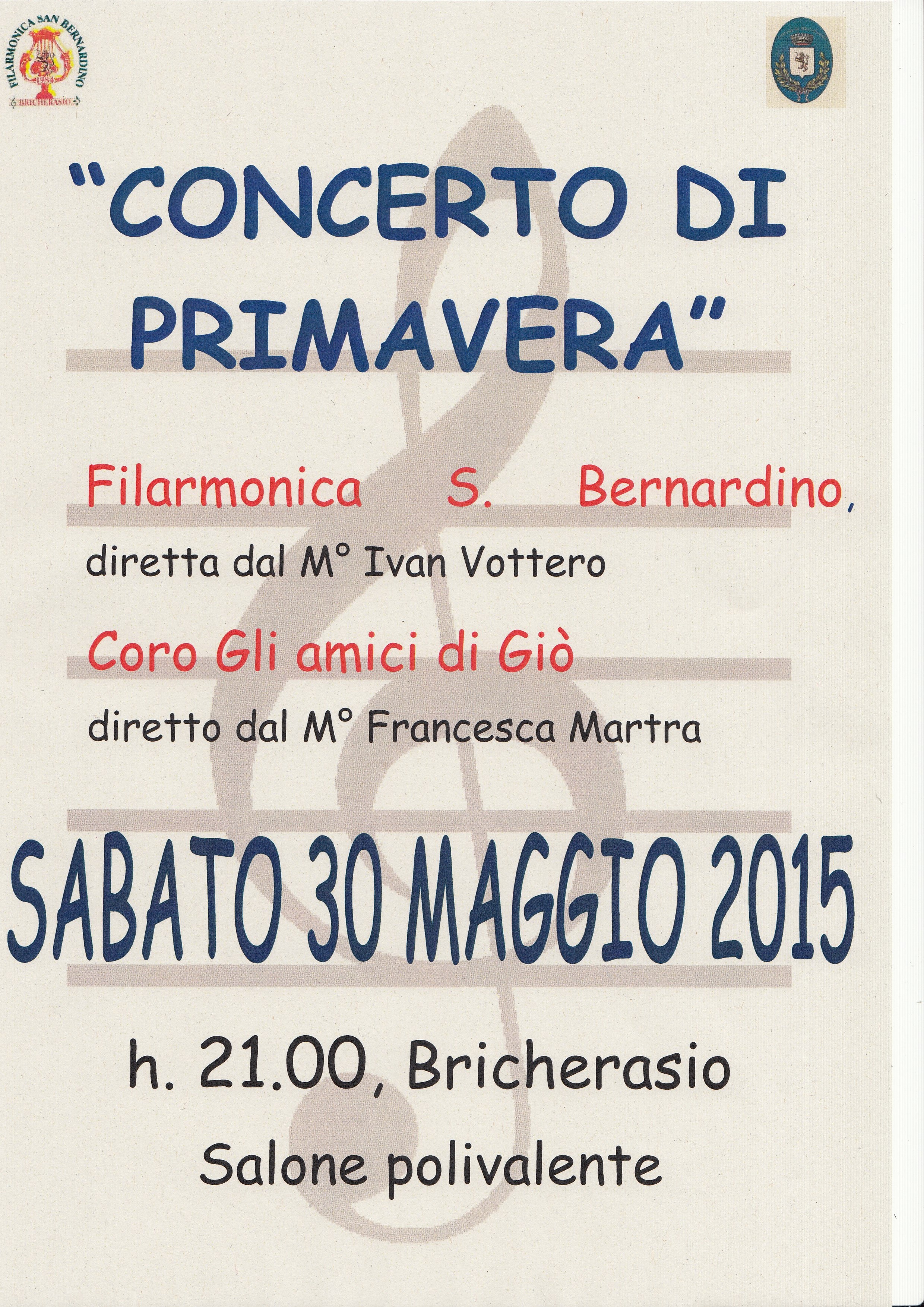 La Filarmonica San Bernardino di Bricherasio, diretta dal Maestro Ivan Vottero presenta, con il patrocinio del Comune, per sabato 30 maggio, alle ore 21,00, nel Salone Polivalente di Piazza Don Vittorio Morero, 2 a Bricherasio, il classico concerto di primavera con ospite il Coro “Gli amici di Giò” diretto dal Maestro Francesca Martra. Ingresso libero.