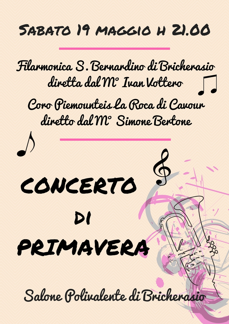 La Filarmonica San Bernardino di Bricherasio diretta dal Maestro Ivan Vottero presenta, con il patrocinio del Comune, per sabato 19 maggio alle ore 21,00, nel Salone Polivalente di Piazza Don Vittorio Morero, 2 a Bricherasio, l’immancabile concerto di primavera con ospite il “Coro Piemonteis La Roca” di Cavour diretto dal Maestro Simone Bertone.