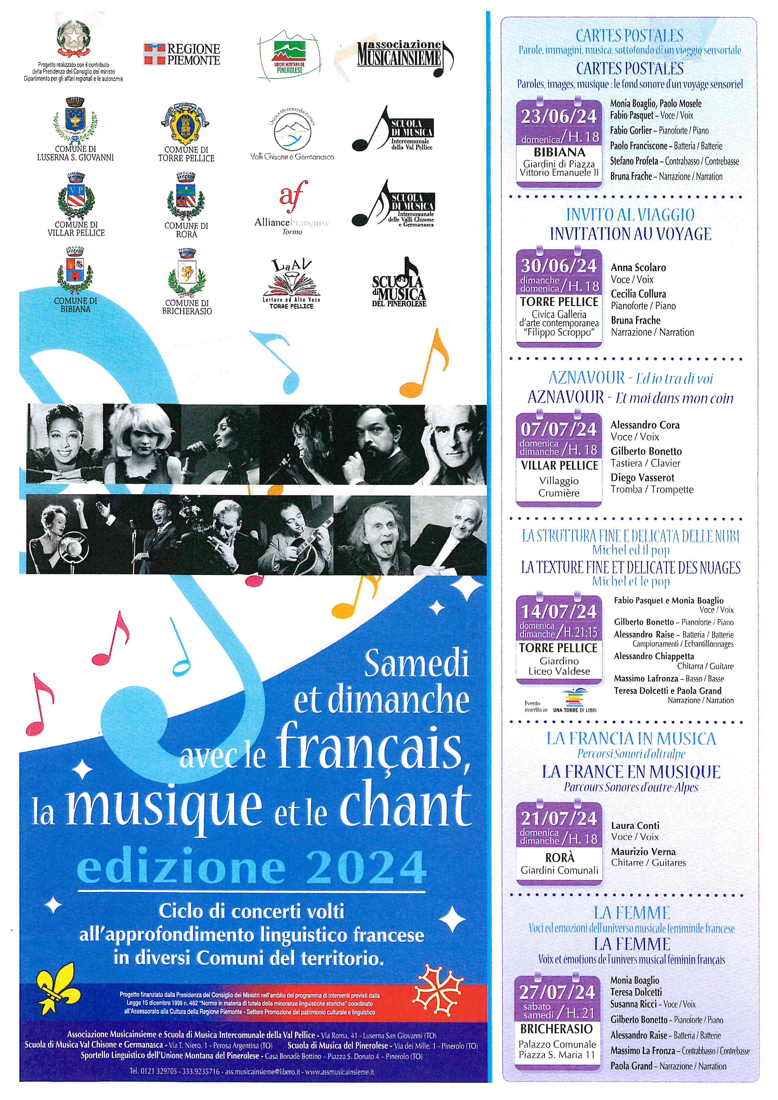 Nell'ambito della rassegna "Samedi et dimanche avec le francais, la musique et le chant 2024", l'Associazione Musicainsieme ed il Comune di Bricherasio presentano sabato 27 luglio alle ore 21.00 nel Palazzo Comunale (Piazza Santa Maria, 11) il concerto "La Femme", voci ed emozioni dell’universo musicale femminile francese. Ingresso libero (info: 0121.329705 – 333.9235716).