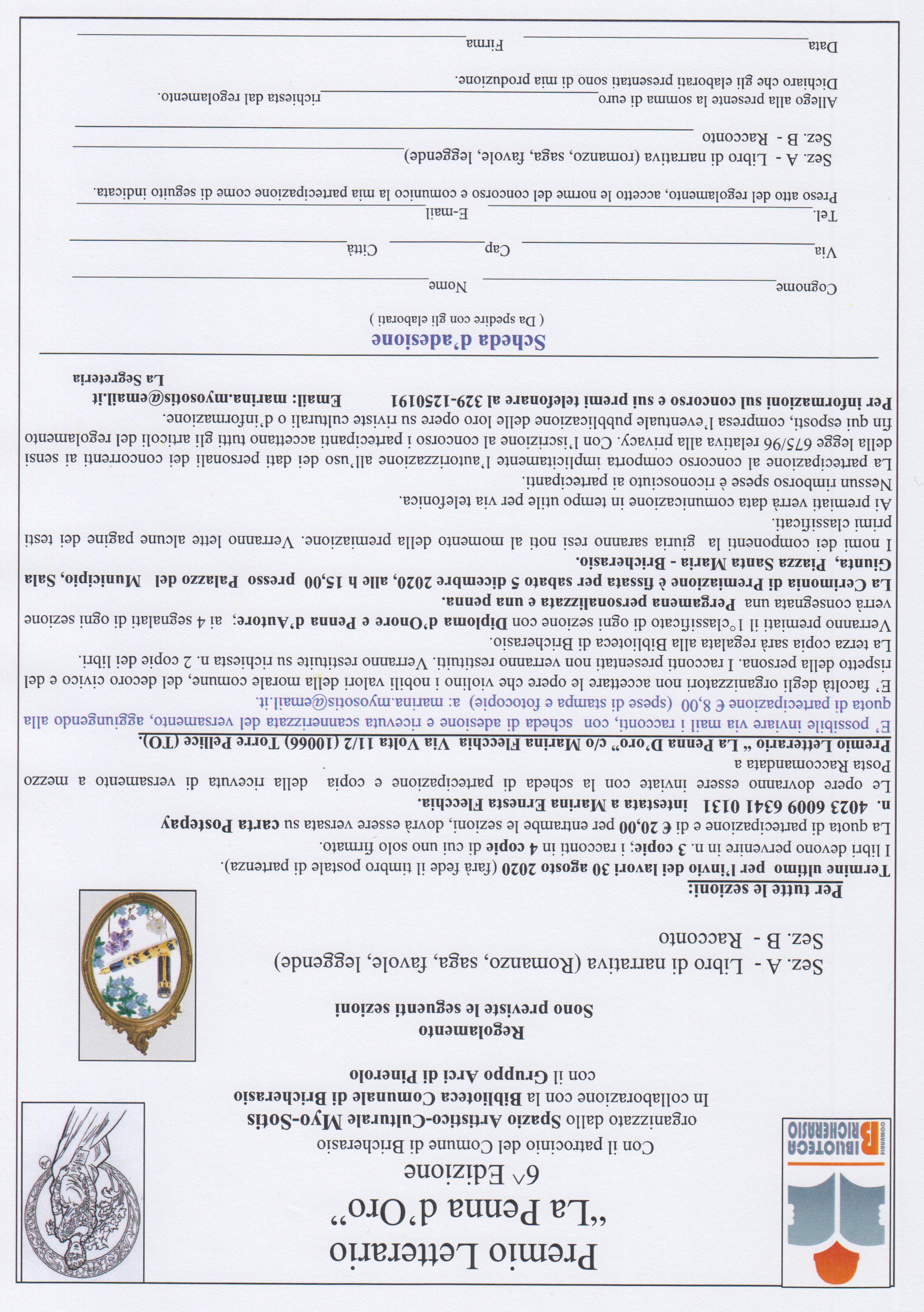 Lo Spazio Artistico-Culturale Myo-Sotis in collaborazione con la Biblioteca Comunale di Bricherasio ed il Gruppo ARCI di Pinerolo con il patrocinio del Comune di Bricherasio organizzano la 6^ Edizione Premio Letterario “La Penna d’Oro” ed il Premio Artistico–Culturale Città di Bricherasio, denominato “Le mille sfaccettature dell'amore” giunto alla 8^ edizione. Sono previste due sezioni, la A per il Libro di narrativa (Romanzo, saga, favole, leggende) e la sezione B che riguarda il Racconto Gli organizzatori hanno la facoltà di non accettare le opere che violino i nobili valori della morale comune, del decoro civico e del rispetto della persona. I racconti presentati non verranno restituiti. Verranno restituite su richiesta due copie dei testi mentre la terza copia sarà regalata alla Biblioteca di Bricherasio. Verranno premiati il 1°classificato di ogni sezione con Diploma d’Onore e Penna d’Autore; ai 4 segnalati di ogni sezione verrà consegnata una Pergamena personalizzata e una penna. La Cerimonia di Premiazione è fissata per sabato 5 dicembre, alle ore15,00 presso Palazzo del Municipio, Sala Giunta, Piazza Santa Maria - Bricherasio. I nomi dei componenti la giuria saranno resi noti al momento della premiazione. Verranno lette alcune pagine dei testi primi classificati. Ai premiati verrà data comunicazione in tempo utile per via telefonica. Per informazioni sul concorso e sui premi scrivere alla e-mail: marina.myosotis@email.it oppure telefonare al 329/1250191.