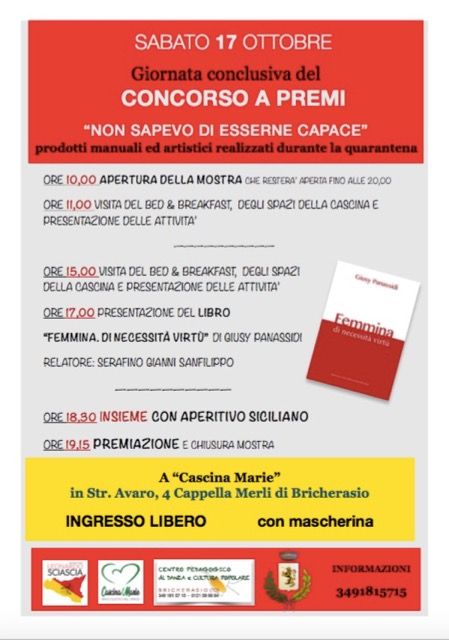 L'Associazione culturale "Leonardo Sciascia" di Bricherasio e il Centro Pedagocigo di danza e cultura popolare e il Bed & Breakfast Cascina Marie di Cappella Merli vi ivitano ad ammirare l'allestimento visivo di alcuni prodotti, elaborati, ideazioni, creazioni, pitture, costruzioni realizzati durante il periodo della quarantena primaverile, dal titolo "Non sapevo di essere capace" nella giornata conclusiva del concorso a premi di sabato 17 ottobre 2020 dalle ore 10 con orario continuato fino alle ore 20 al Bed & Breakfast Cascina Marie in Strada Avaro, 4 a Bricherasio. Quattro le sezioni previste “Io gioco con la didattica” per i bambini con premio finale un weekend in un bad & breakfast con i genitori; per i ragazzi la sezione “Io creo”, il premio è un buono spesa da utilizzare in un negozio di prodotti per i personal computer. Per gli adulti “Io produco” con vittoria di un buono spesa da usare in una macelleria, la sezione per gli artisti prevede la vincita di un buono collettivo per dieci aperitivi ed è chiamata “Arteinquarantena”. Erano incluse tutte le arti dalla musica al disegno, dalla fotografia alla pittura passando per la storia, l’uncinetto, la poesia, la letteratura, la danza, la creta, il riciclo e molte altre con il concorso rivolto ai residenti della Val Pellice. Il programma prevede l’apertura alle ore 10 della mostra ed alle 11 comincia la visita dei locali, degli spazi della cascina e presentazione delle attività che ripartono alle ore 15. La presentazione del libro “FemmIna di necessità virtù" di Giusy Panassidi, con la presenza della scrittrice alle 17 precede il momento di condivisione Insieme con un aperitivo siciliano. Alle 19,15 la premiazione dei lavori. Ingresso libero all’evento con mascherina di protezione e sarà senza dubbio piacevole trascorrere un momento culturale e da protagonisti tutti insieme. Gli organizzatori attendono numerosi partecipanti e maggiori informazioni da Lilly Di Martino al numero 338/4537003 oppure Maria Baffert al 349/1815715.