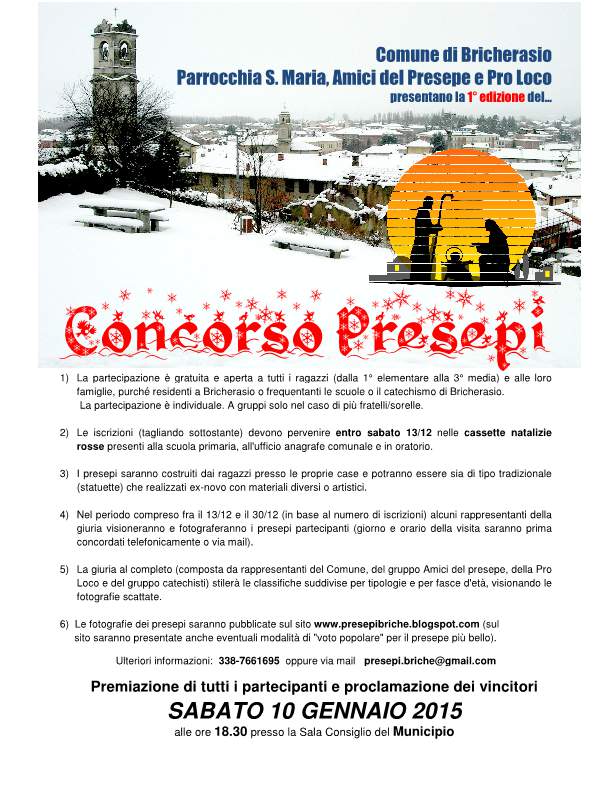 Sabato 10 gennaio alle 18,30 in Municipio la proclamazione dei vincitori del concorso presepi e la premiazione di tutti i partecipanti a cura di Comune, Parrocchia, Pro Loco ed Amici del Presepe.