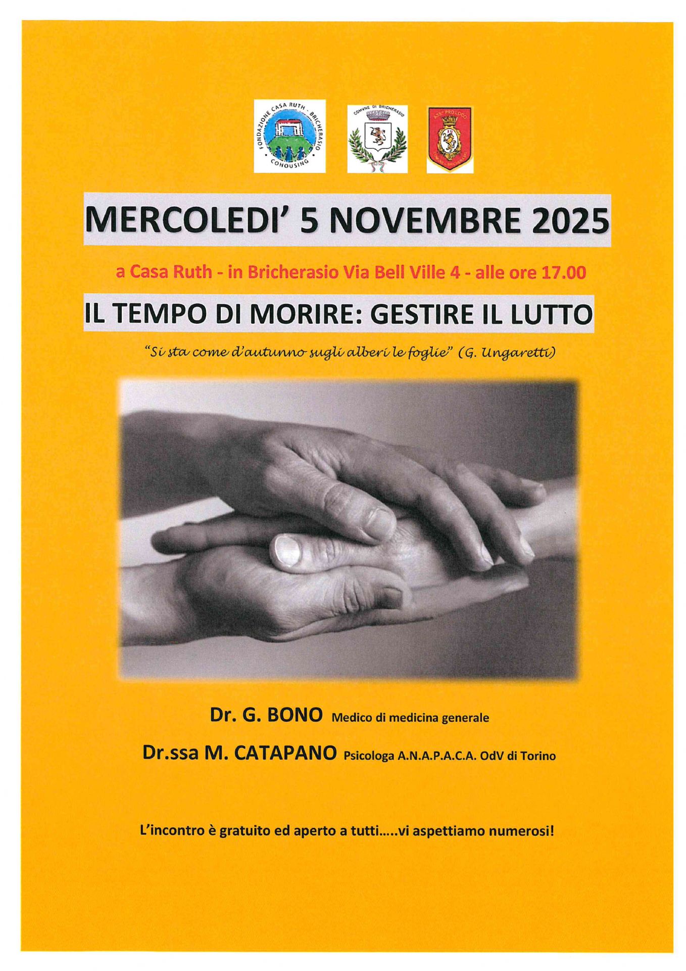 Mercoledì 5 novembre a partire dalle ore 17 la cohousing "Casa Ruth", in Via Bell Ville 4 a Bricherasio, presenta l’incontro “Il tempo di morire: gestire il lutto” con il medico di medicina generale, Dottor Giuliano Bono e la psicologa Dottoressa Catapano. L’incontro, ad ingresso libero, è aperto a tutti.