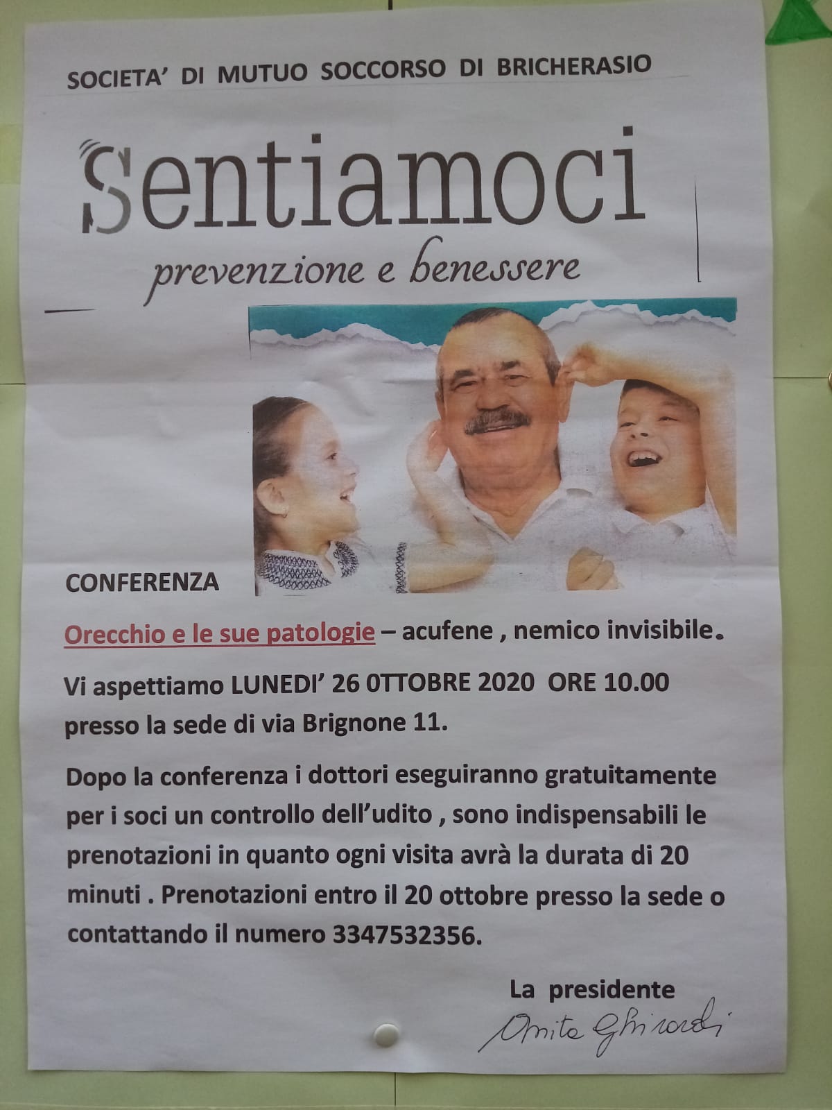 La Società di Mutuo Soccorso di Bricherasio organizza per lunedì 26 ottobre alle ore 10 una conferenza sull’udito dal titolo “Sentiamoci, prevenzione e benessere” nella propria sede di Via Brignone, 11. Si parlerà delle patologie dell’orecchio con il nemico invisibile dell’acufene. Dopo la conferenza i dottori eseguiranno gratuitamente ai soci presenti un controllo dell’udito per cui è indispensabile prenotarsi in quanto ogni visita avrà la durata di 20 minuti. Per informazioni e prenotazioni rivolgersi alla Presidente Anita Ghirardi al 334/7532356.