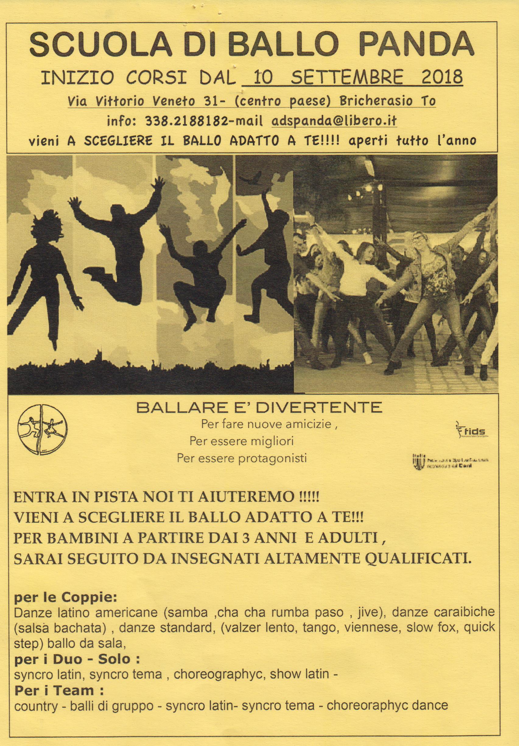 A Bricherasio la scuola di ballo Panda in Via Vittorio Veneto, 31 organizza dei corsi di ballo, aperti tutto l'anno, per coppie, duo e team. I corsi per le coppie sono di danze latino americane come samba, cha cha, paso e rumba, danze standard (valzer, lento, tango, viennese e quick step) e ballo da sala. Per i duo previsti corsi di syncro latin, syncro tema, choreographyc e show latin mentre per i team di ballo country, syncro latin, syncro tema e choreographyc dance. Sono aperti a tutti dai bambini a partire dai 3 anni con insegnanti qualificati. Per maggiori informazioni telefonare al numero 338/2188182.