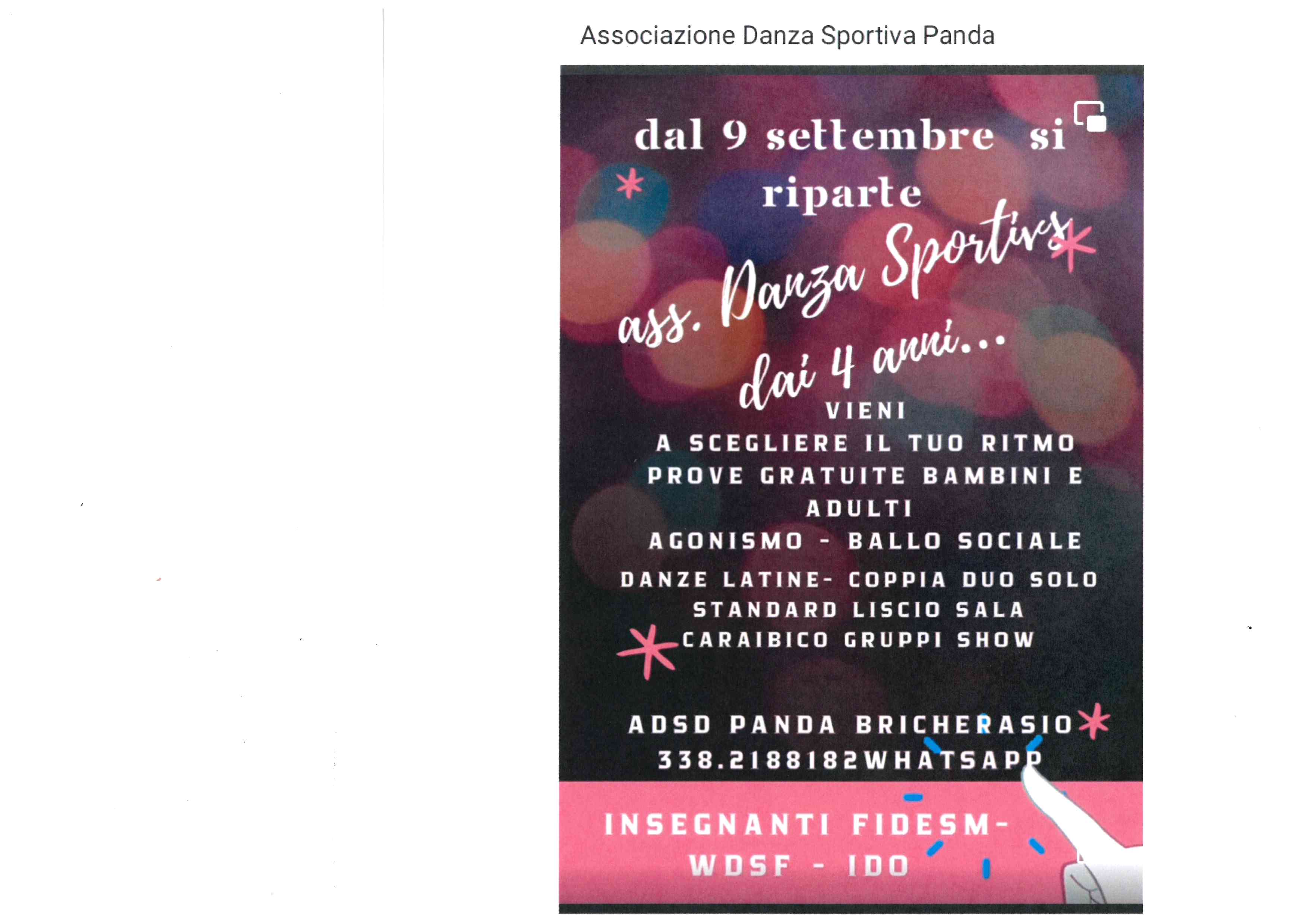 A Bricherasio la scuola di ballo ADSD Panda in Via Vittorio Veneto 31 organizza dei corsi di ballo, a partire da lunedì 9 settembre. Ballare è divertente, si fanno nuove amicizie, si migliora e si è protagonisti. Si può imparare una disciplina seria, un nuovo modo di ballare attraverso le coreografie di gruppo oppure in coppia e scegliere il proprio ritmo per bambini dai 4 anni e per adulti. I corsi previsti sono di danze latine, coppia duo solo, standard liscio da sala e caraibico gruppi show. Per maggiori informazioni telefonare all’Associazione Danza Sportiva al numero 3382188182.