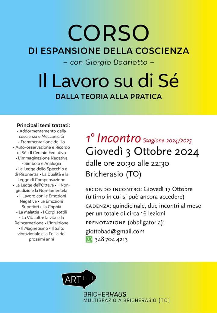Il multispazio Art +++ Bricherhaus organizza a partire da giovedì 3 ottobre, dalle ore 20.30 alle 22,30 nella propria sede di Via Vittorio Emanuele II 5 a Bricherasio un corso di espansione della coscienza con Giorgio Badriotto nel quale verranno trattati svariati argomenti come il lavoro con le emozioni, la follia e la malattia. Si svolgono due incontri al mese per un totale di sedici lezioni sempre al giovedì. Per prenotazioni e maggiori informazioni scrivere una mail a giottobad@gmail.com oppure telefonare al 3487044213.