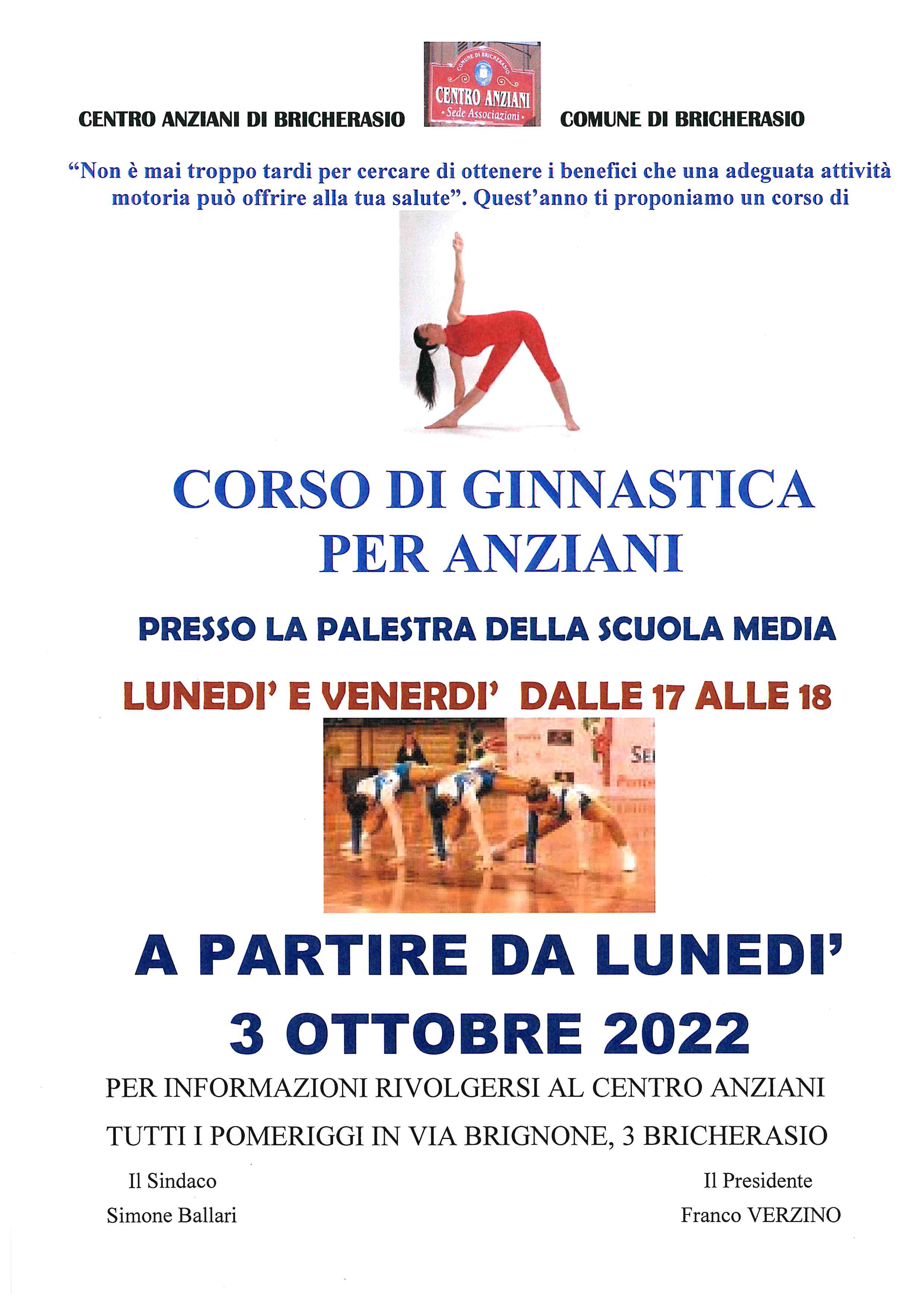 Il Centro Anziani di Bricherasio organizza il corso di ginnastica per anziani che si svolge nella palestra delle Scuole Medie il lunedì ed il venerdì dalle 17 alle 18 a partire da lunedì 3 ottobre. Chi è interessato a partecipare e per informazioni rivolgersi tutti i pomeriggi, dalle ore 15,00 alle 18,00, presso il Centro Anziani di Via Brignone, 3 a Bricherasio.
