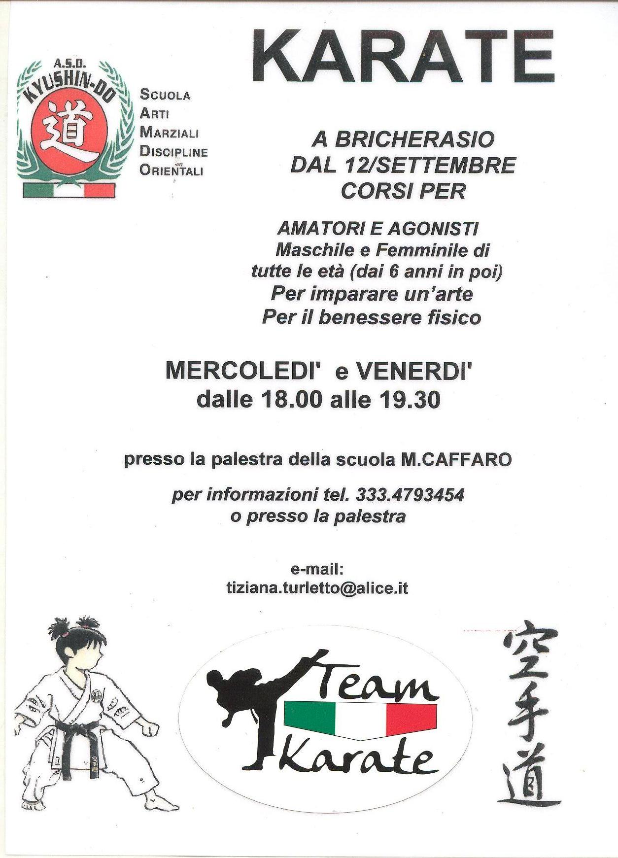L’Associazione KyuShin-Do di Bricherasio organizza nei prossimi mesi un corso di karate curato del maestro federale Gianlivio Rodolfi. Le lezioni si baseranno sullo studio della preparazione psicologica e fisica per affrontare al meglio situazioni di rischio ed in particolare l’attenzione sui metodi di allenamento che rendano le tecniche efficaci ed applicabili. Il corso è aperto ad amatori ed agonisti di 6 anni in avanti e si svolge presso la palestra delle Scuole Medie di Bricherasio a partire da mercoledì 12 settembre alle ore 18 e si tiene con cadenza bisettimanale pure il venerdì alla stessa ora. Per informazioni rivolgersi al numero 333/4793454.