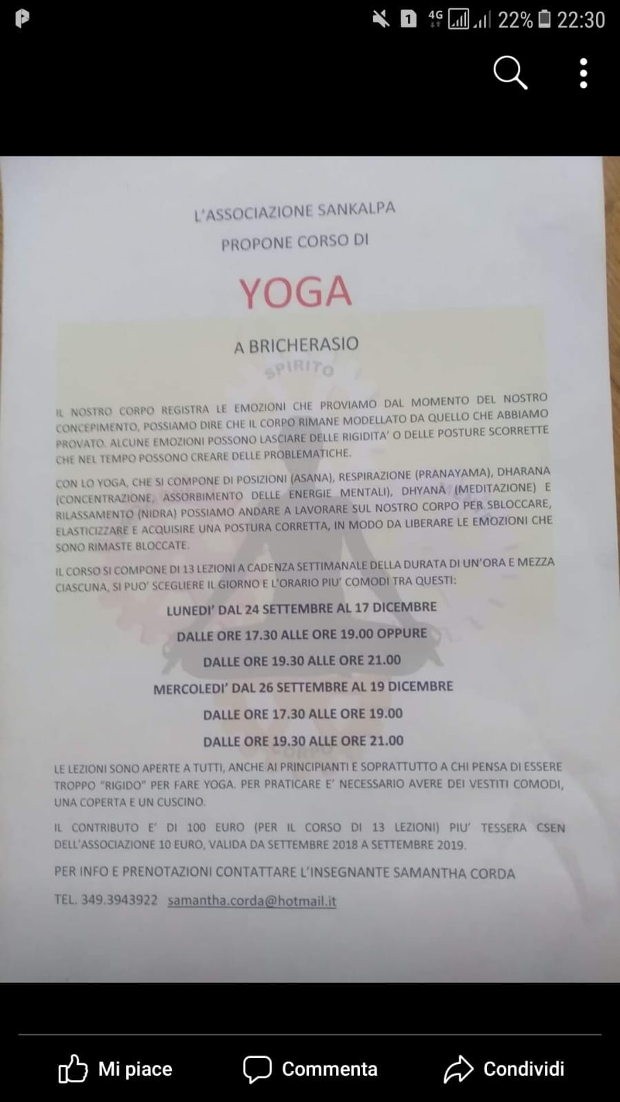 Nata nel settembre del 2014 l’Associazione Sankalpa di Samantha Corda, continua nel proprio percorso del corpo sano in mente sana. Il corso a numero chiuso di yoga è articolato in tredici lezioni a cadenza settimanale che cominciano lunedì 24 settembre e si svolgono nelle ex scuole elementari della frazione Cappella Merli dalle 17,30 alle 19 e dalle 19,30 alle 21. La titolare aggiunge “Per venire incontro alle esigenze dei partecipanti effettuiamo le lezioni anche il mercoledì con gli stessi orari”. Il costo di partecipazione è di 100 € a cui vanno aggiunti 10 € per la tessera di affiliazione al CSEN. Ancora Samantha “Il corso è aperto a tutti, principianti ed esperti durante lo svolgimento si praticano tecniche di respirazione, di postura e di rilassamento”. Sono richiesti abiti comodi, tappetino cuscini e coperta e per ulteriori informazioni e per prenotazioni telefonare al 349-3943922 oppure inviare un email a samantha.corda@hotmail.it