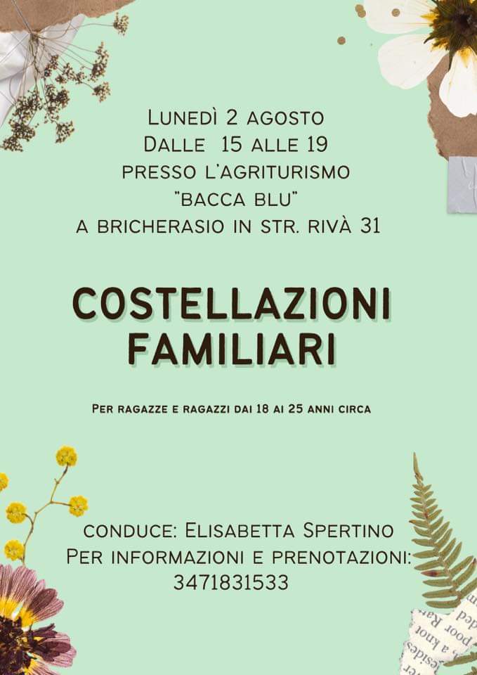 Lunedì 2 agosto dalle ore 15 alle 19 all'Agriturismo La Bacca Blu di Strada Rivà 31, a Bricherasio, si svolgono delle Costellazioni Familiari condotte dalla Dottoressa Elisabetta Spertino, life coach, che aiuta le persone a liberarsi dai blocchi del passato per vivere con gioia la loro vera essenza ed i loro talenti. Un'opportunità per ragazze e ragazzi dai 18 ai 25 anni. Un pomeriggio dedicato a tutti i giovani che sentono il desiderio di guardarsi dentro e liberarsi da pesi ed emozioni limitanti. Per ulteriori informazioni e prenotazioni obbligatorie telefonare al numero 347/1831533.