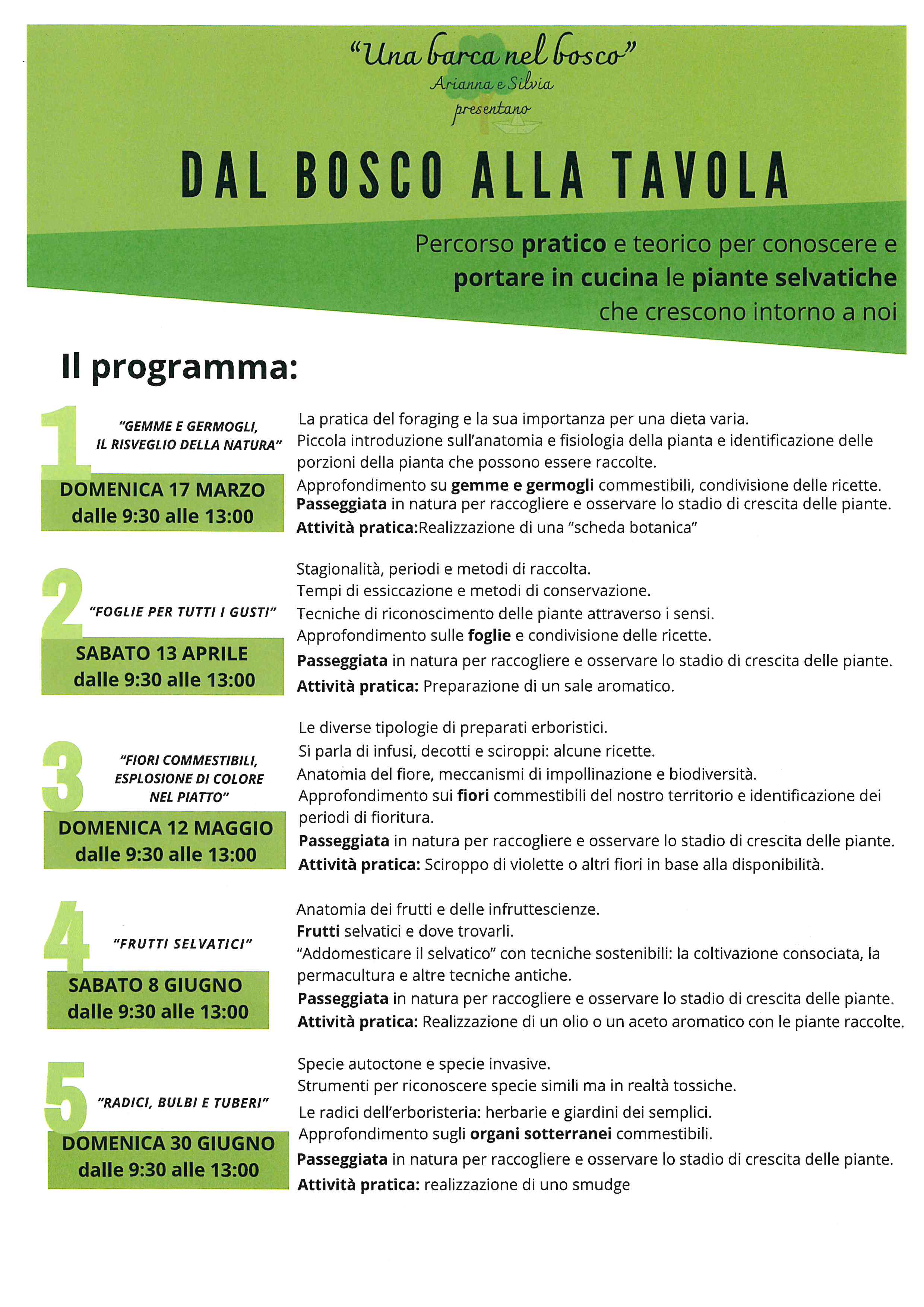 L'Azienda Agricola Geal Pharma (Strada Rivà 20 a Bricherasio) organizza cinque incontri in un percorso pratico e teorico per conoscere e portare in cucina le piante selvatiche che crescono intorno a noi. I ritrovi sono dedicati a chiunque voglia sentirsi un po' chef e un po' botanico con attività di riconoscimento in campo, approfondimenti e laboratori. Il progetto "Una barca nel bosco" comincia domenica 17 marzo e prosegue sabato 13 aprile, domenica 12 maggio, sabato 8 giugno e domenica 30 giugno. E' richiesto un contributo di 30 euro per ogni singolo evento . Per informazioni e prenotazioni scrivere a progetto una barcanelbosco@gmail.com oppure telefonare a Silvia al numero 3382184344.