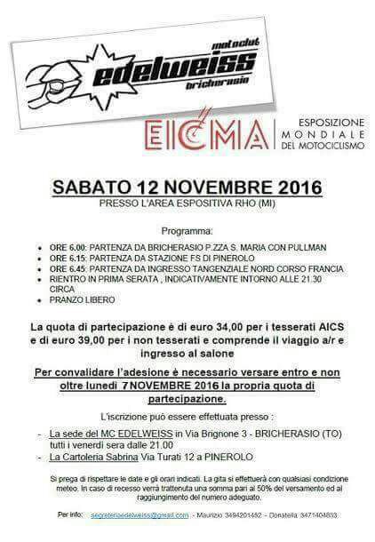Il motoclub Edelweiss di Bricherasio organizza una gita al Salone del ciclo e del motociclo “Eicma 2016” presso l’area espositiva di Rho (Milano) per sabato 12 novembre in occasione della 74^ esposizione mondiale del motociclismo. La giornata prevede la partenza da Piazza Santa Maria alle ore 6,00 in pullman con passaggio alla stazione FS di Pinerolo per accogliere altri partecipanti e all’ingresso della tangenziale al’altezza di Corso Francia verso le 6,45 con il rientro in prima serata, indicativamente verso le 21,30. Pranzo libero. La quota di partecipazione di 34,00 € per i tesserati AICS e di 39,00 € per gli sprovvisti, e comprende viaggio e l’ingresso al salone. Maggiori informazioni e prenotazioni entro lunedì 7 novembre presso la sede del motoclub, in via Brignone, 3 a Bricherasio tutti i venerdì sera a partire dalle ore 21,00 oppure alla cartoleria Sabrina di via Turati, 12 a Pinerolo.