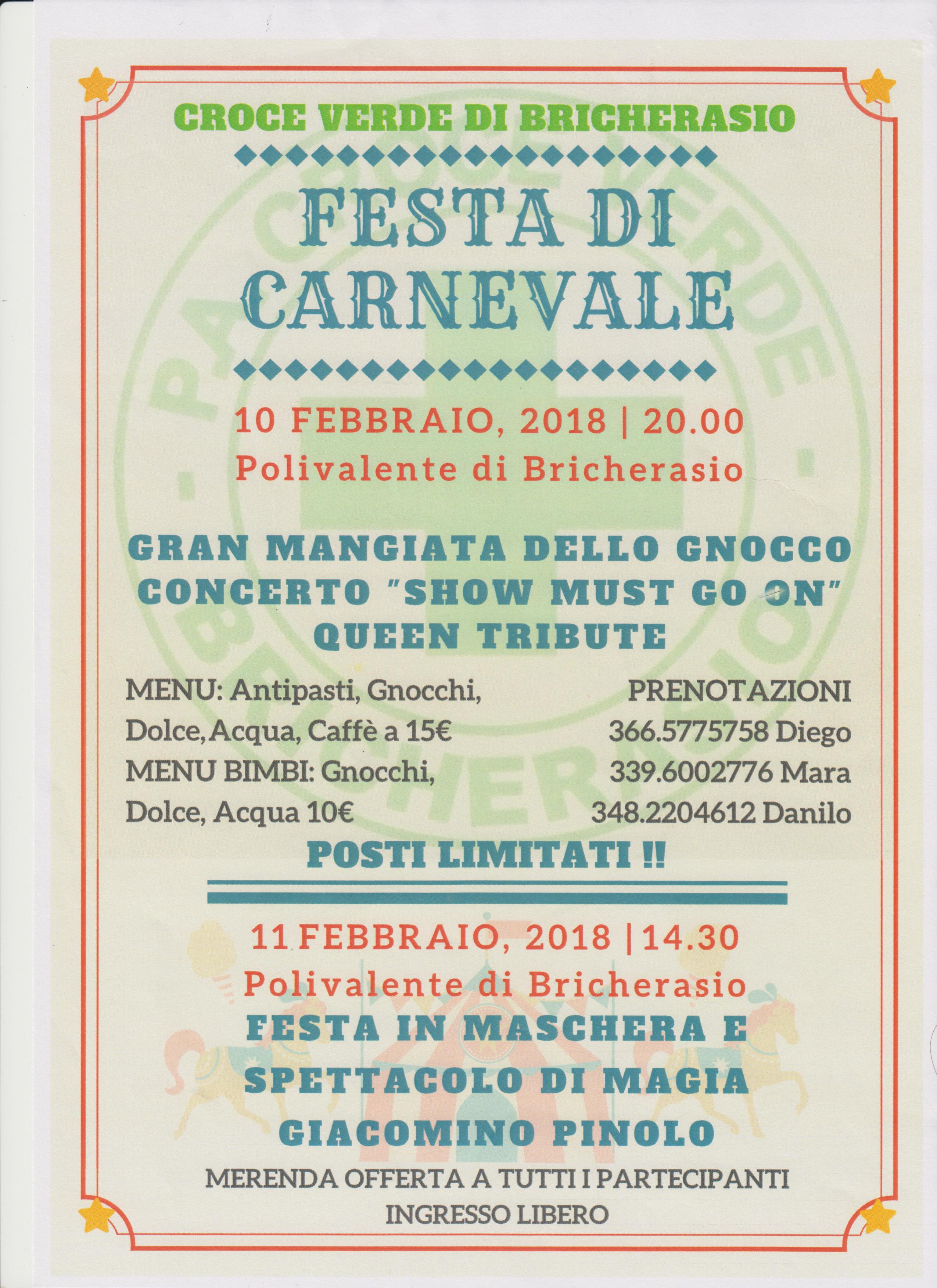 La Croce Verde di Bricherasio organizza la festa di Carnevale per sabato 10 e Domenica 11 febbraio al Salone Polivalente di Piazza Don Morero. Alle 20 di sabato gran mangiata dello gnocco a 15 € con posti limitati per cui occorre prenotare da Diego al 366-5775758, da Mara 339-6002776 oppure da Danilo al 348-2204612, e il ricavato della cena verrà utilizzato per l’acquisto di un mezzo per il trasporto dei disabili. Alle ore 22 concerto gratuito del gruppo “Show must go on”, band che tributa i Queen. Domenica 11, a partire dalle 14,30, sempre al Salone Polivalente spettacolo di magia con Giacomino Pinolo e merenda offerta a tutti i partecipanti.