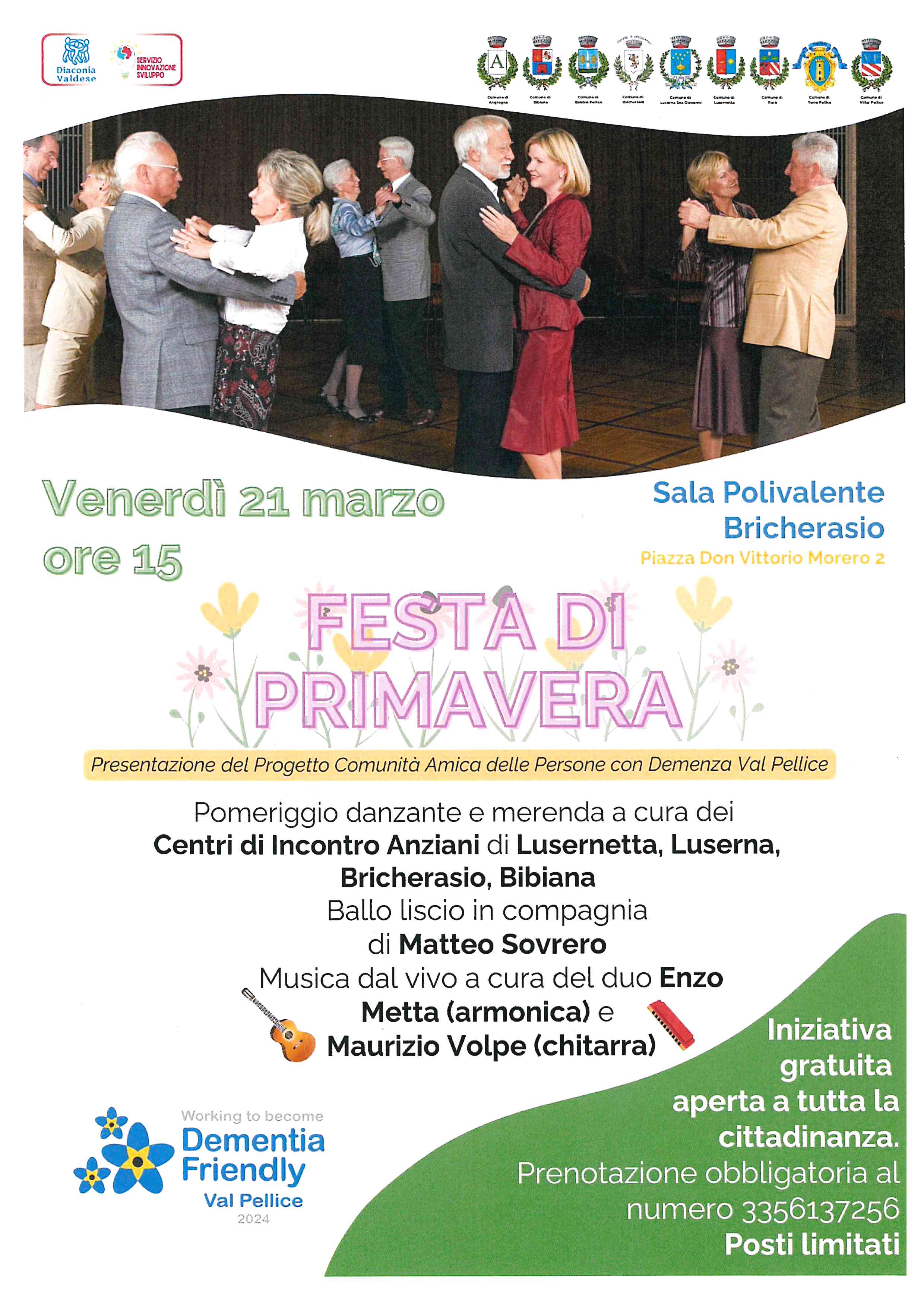 Il Centro Anziani di Bricherasio in collaborazione con i centri d’incontro di Bibiana, Luserna e Lusernetta propone per venerdì 21 marzo, a partire dalle ore 15, la festa di Primavera al Salone Polivalente di Piazza Don Morero, 2. Sarà l'occasione per trascorrere un pomeriggio con ballo liscio in compagnia di Matteo Sovrero e musica dal vivo a cura del duo Enzo Metta che suona l’armonica e Maurizio Volpe la chitarra. L’iniziativa gratuita è aperta a tutta la cittadinanza e poichè i posti sono limitati la prenotazione è obbligatoria al 3356137256.