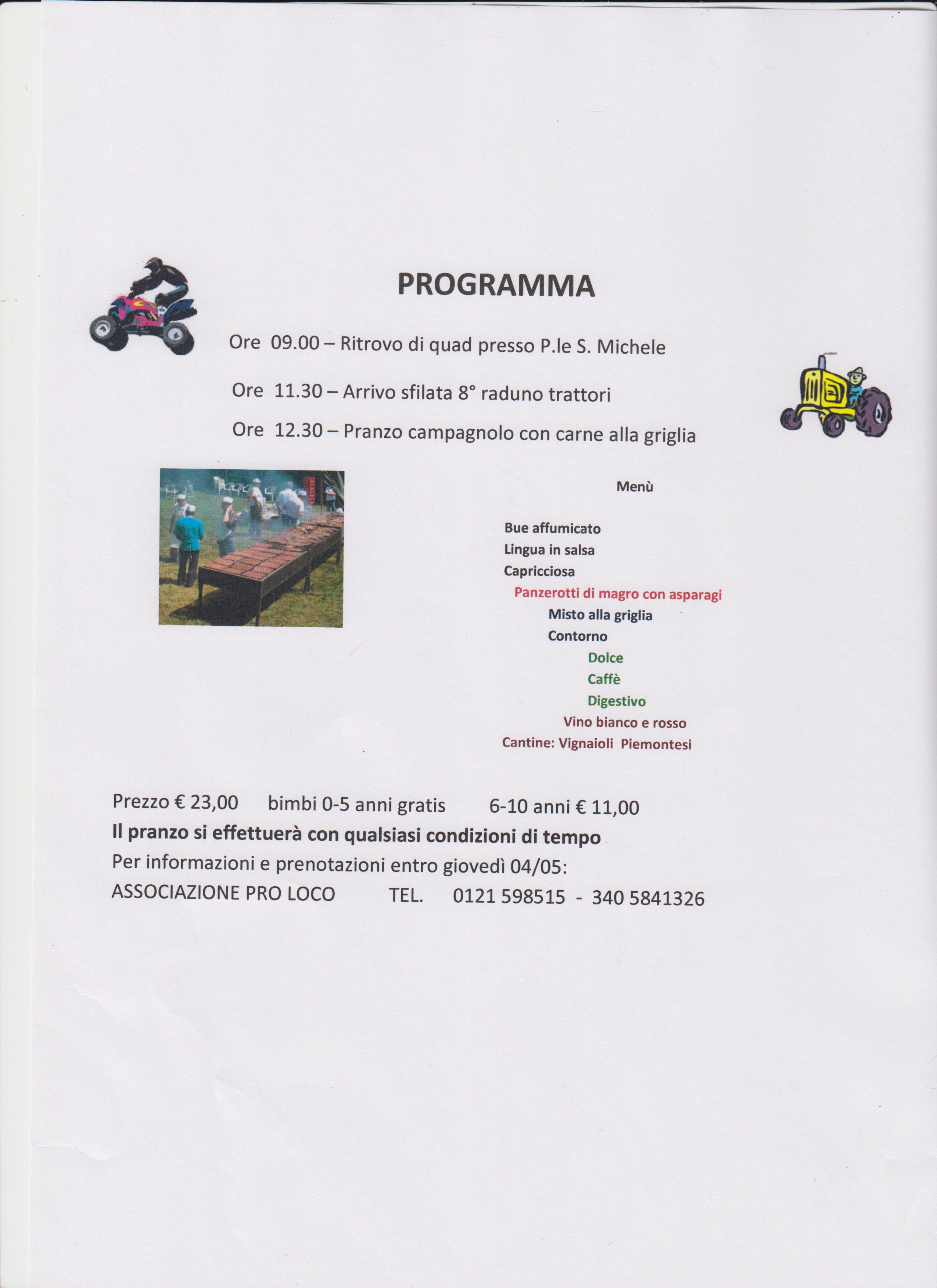 Bricherasio, tra le sue tante peculiarità, è nota anche per la sua festa di primavera, nella frazione di San Michele sempre prevista agli inizi di maggio, quando le temperature aumentano e i primi alberi sono in fiore. La Pro Loco di Bricherasio in collaborazione con Gli amici di San Michele organizzano infatti per Domenica 7 maggio nella frazione di San Michele di Bricherasio la popolare e tradizionale Festa di Primavera con l’ottavo Raduno Trattoristico, il ritrovo dei quad e l’immancabile grande grigliata. Il programma prevede il ritrovo dei quad alle ore 9,00 presso il piazzale di San Michele e quello dei trattori alle 9,30 presso il Salone Polivalente di Piazza Don Morero per l’iscrizione e l’aperitivo. Alle 10,30 la partenza e la sfilata per il paese dei trattori. Alle 11,30 l’arrivo a San Michele per il pranzo campagnolo che si effettuerà su prenotazione e con qualsiasi condizioni di tempo dato che si svolgerà sotto i capannoni della Pro Loco. Per iscriversi al convivio telefonare entro giovedì 4 maggio ai numeri di Renato Bertolino 333/8976551, di Paolo Gamba 333/1225373 oppure alla Pro Loco al 340/5841326. Per l’iscrizione al raduno trattoristico con l’aperitivo il costo è di € 8,00, con il pranzo il prezzo è di 25,00 € entro giovedì 5 perché non sarà più possibile prenotarsi la Domenica solo per mangiare. Alle ore 16 la ricca premiazione dei partecipanti al raduno dove a tutti verrà consegnato un pacco omaggio e saranno gratificati ulteriormente il conducente più giovane, il meno giovane, il trattore più anziano e quello più giovane, chi proviene da più lontano e il mezzo con maggior potenza in cavalli fiscali deducibile dal libretto.