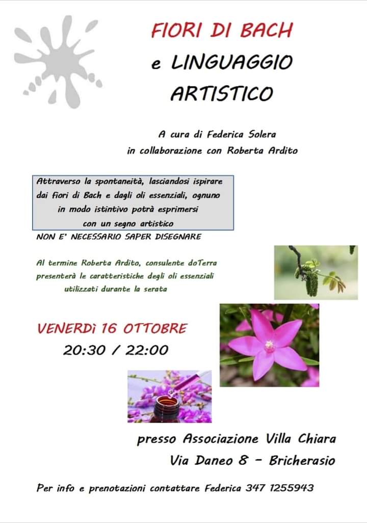 Dopo l’emergenza Coronavirus ripartono le molteplici attività dell'Associazione Villa Chiara di Bricherasio che organizza nella propria sede in Via Daneo, 8 a Bricherasio un incontro serale per venerdì 16 ottobre, dalle ore 20,30 alle 22 con tema “Fiori di Bach e linguaggio artistico”. Attraverso la spontaneità, lasciandosi ispirare da oli essenziali e fiori di Bach ognuno in modo istintivo potrà esprimersi con un sogno artistico e non è necessario saper disegnare per partecipare. Al termine la consulente Roberta Ardito presenta le caratteristiche degli oli utilizzati durante la serata. Per maggiori informazioni e prenotazioni contattare Federica al 347/1255943.