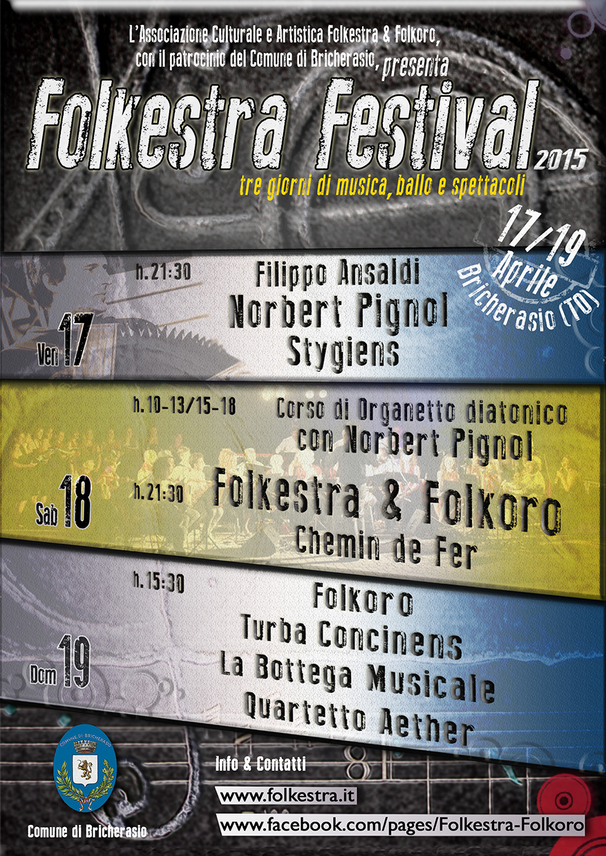 L'Associazione Culturale e Artistica Folkestra & Folkoro, con il patrocinio del Comune di Bricherasio, organizza, dal 17 al 19 aprile prossimi, il “Folkestra Festival 2015”, tre giorni di musica, ballo e spettacoli. In continuo fermento, “Folkestra Nights ”, quest'anno assume le vesti di un Festival, in cui si esibiranno, come sempre, grandi musicisti accompagnati dalle giovani leve del folk che nascono e crescono all'interno dell'Associazione, nonché alcune consolidate formazioni e nuove tendenze del canto corale. Il tutto nel solco ormai segnato dal nostro progetto artistico: quello di sfumare i confini tra la musica popolare e la musica colta, e di creare ponti tra l'universo contemporaneo e quello tradizionale.