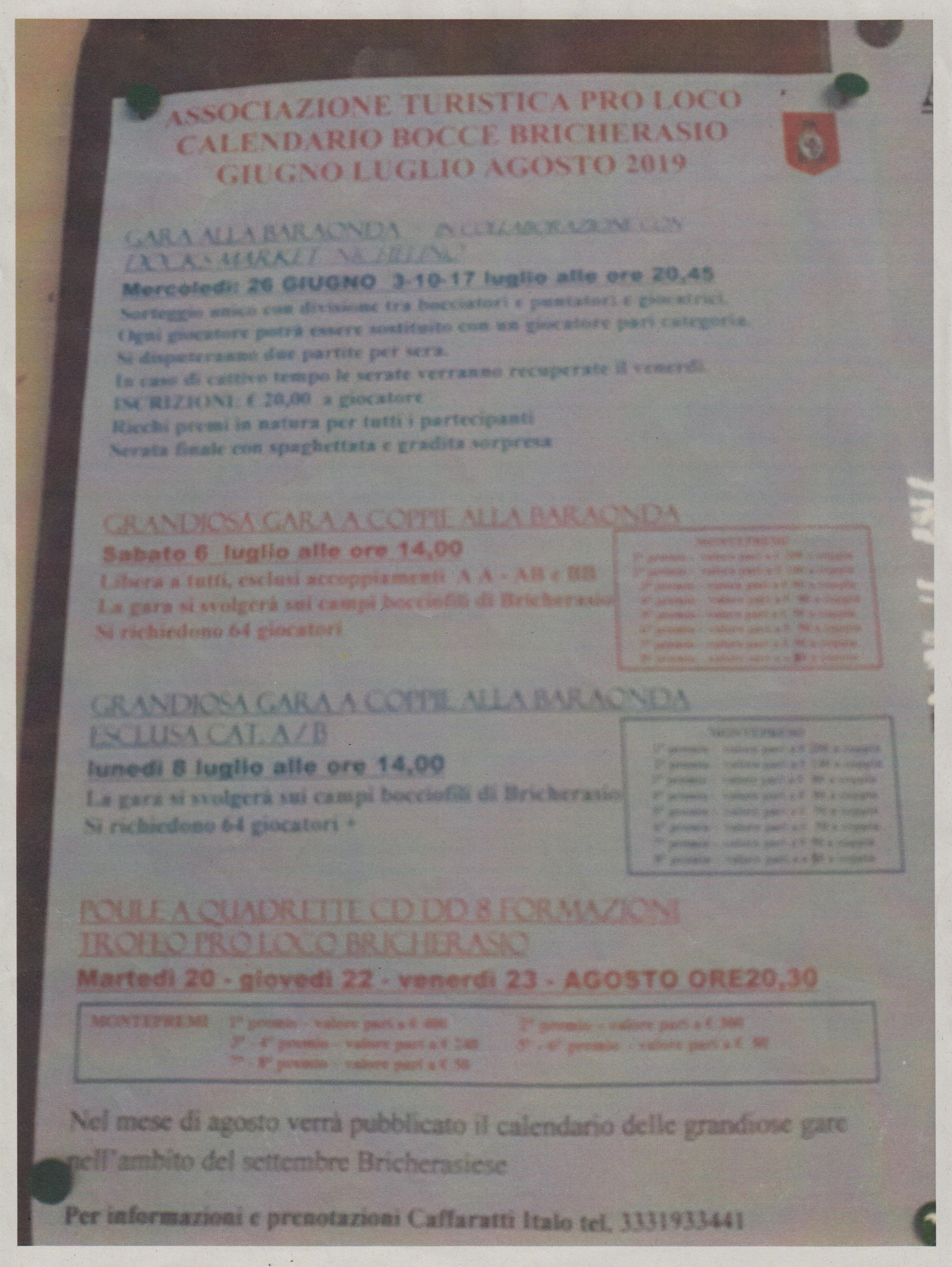 L’Associazione Turistica Pro Loco di Bricherasio nel proprio calendario delle gare alle bocce del 2019 sui campi tracciati di Piazza Santa Maria, 11 ha inserito una poule a quaterne CD-DD con otto formazioni che si contendono il Trofo Pro Loco martedì 20, giovedì 22 e venerdì 23 agosto con inizio alle ore 20,30. Il primo premio è di valore pari a 400 €, il secondo di 300 €, poi a seguire i terzi e quarti vincono 240 €, il quinto e sesto posto si aggiudicano 80 € e le squadre che arrivano settime ed ottave vengono ricompensate con 50 €. Per maggiori informazioni rivolgersi a Italo Caffaratti al 333/1933441.