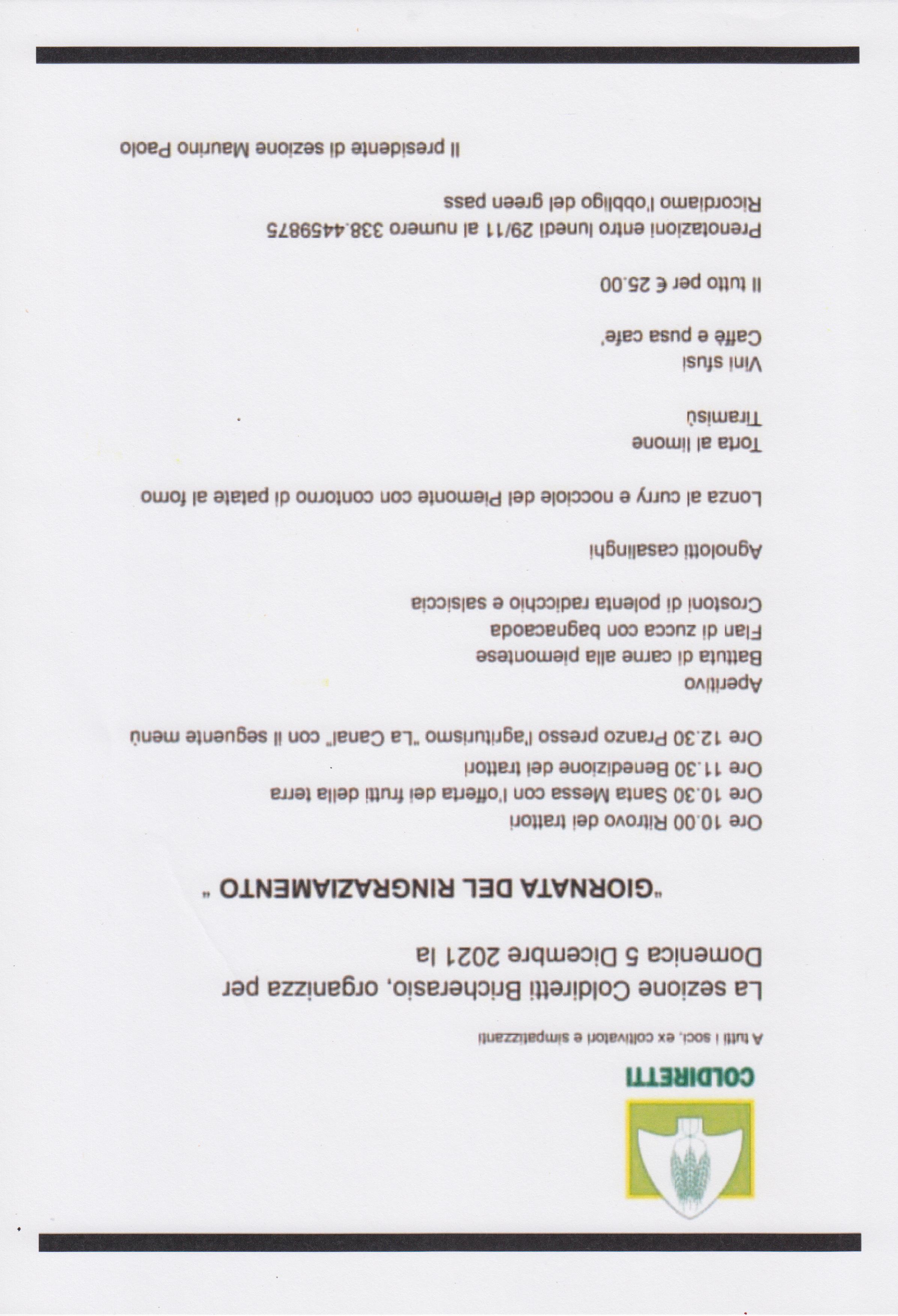 Domenica 5 dicembre si svolge a Bricherasio la Giornata del Ringraziamento promossa dai Coltivatori diretti con ritrovo dei trattori in Piazza Santa Maria alle ore 10, a seguire Santa Messa con l’offerta dei frutti della terra e benedizione dei mezzi agricoli. Alle 12,30 il pranzo all’Agriturismo “La Canal” con un ricco menù della tradizione contadina. Il costo della giornata è di 25 € prenotandosi entro lunedì 29 novembre al numero 338/4459875. Si ricorda che per accedere al pranzo occorre essere in possesso del green pass.
