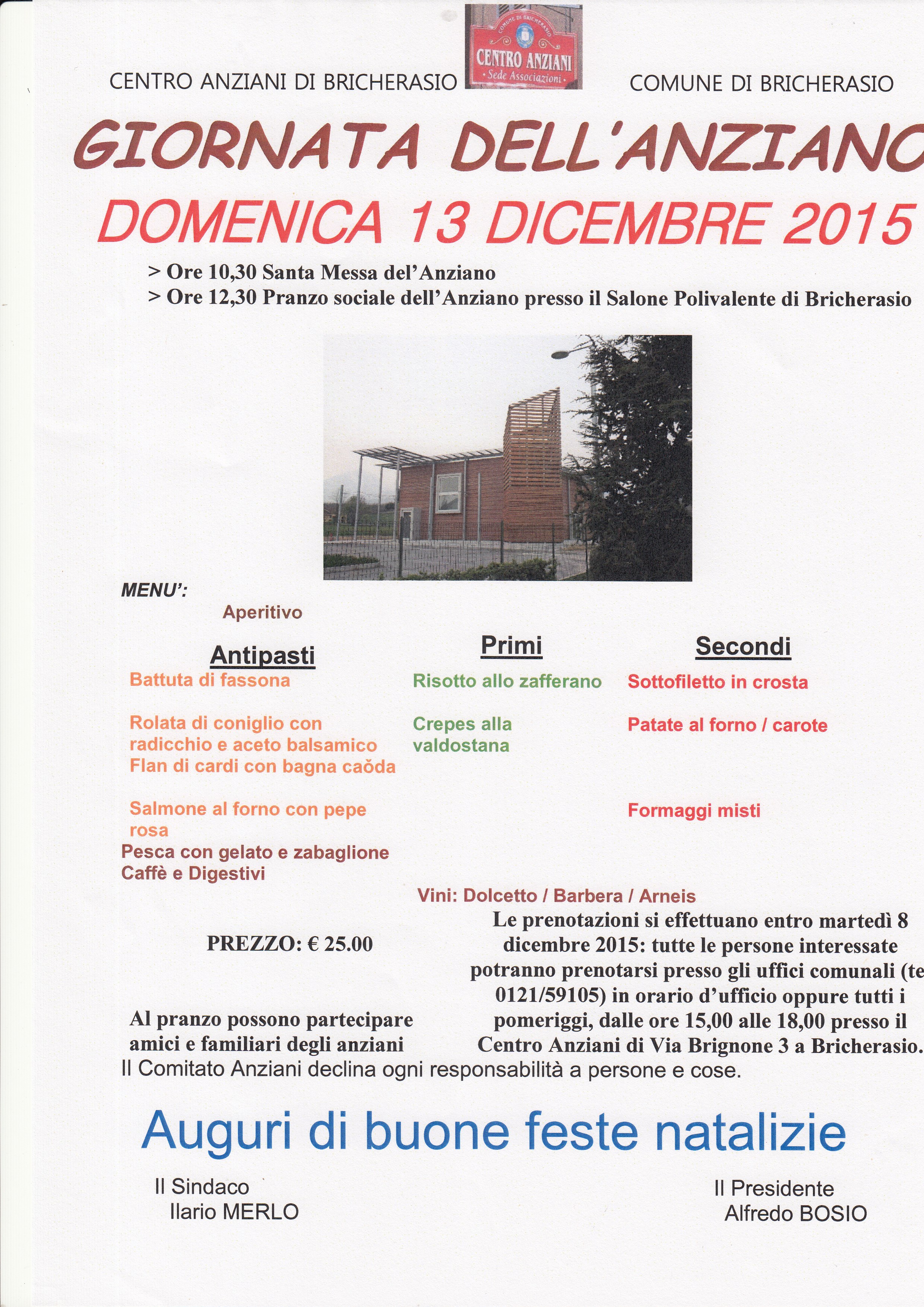 Il Comitato Anziani di Bricherasio, in collaborazione con il Comune, organizza la consueta giornata dell’Anziano per Domenica 13 dicembre con il seguente programma: alle ore 10,30 la Santa Messa e alle 12,30 il pranzo sociale dell’Anziano presso il Salone Polivalente di Bricherasio di Piazza Don Morero. Il prezzo è stabilito in € 25,00 comprende aperitivo, quattro antipasti, due primi piatti, carne con contorni, formaggi, dolce, caffè e digestivi. Informazioni e prenotazioni entro martedì 8 dicembre presso gli uffici comunali di Bricherasio (0121/59105) negli orari di apertura al pubblico o tutti i pomeriggi, dalle ore 15,00 alle 18,00, al Centro Anziani di Via Brignone, 3. Al pranzo possono partecipare amici e familiari degli anziani. La manifestazione rientra nella diciassettesima edizione del Natale in allegria bricherasiese.