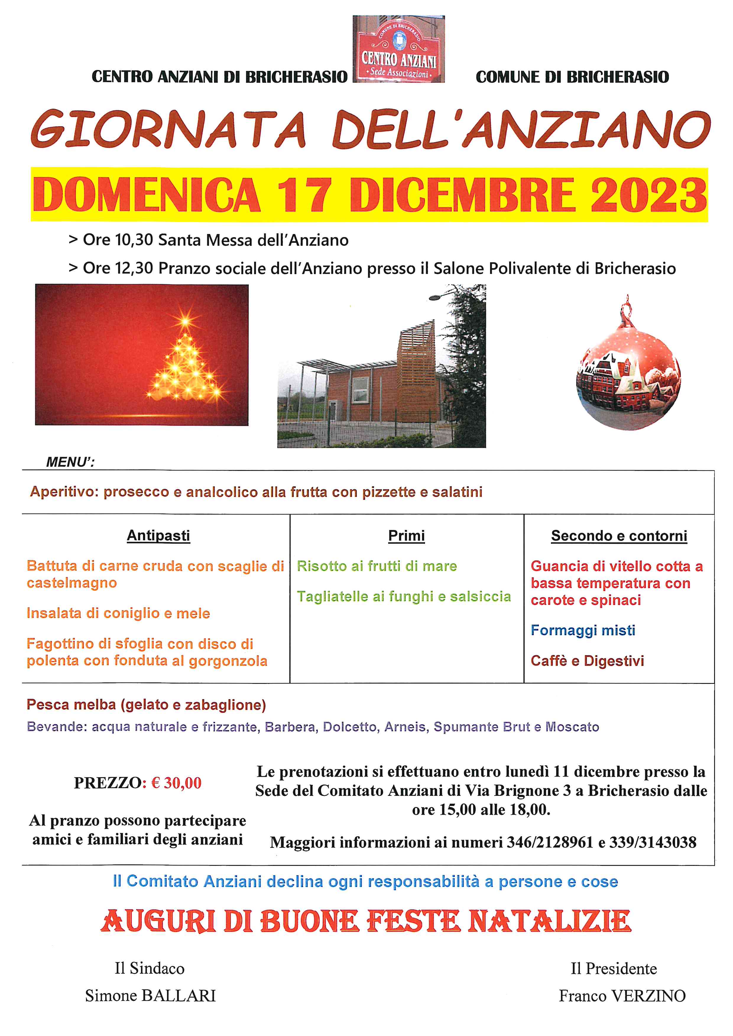 Il Comitato Anziani di Bricherasio, in collaborazione con il Comune, organizza la giornata dell’Anziano per Domenica 17 dicembre con il seguente programma: alle ore 10,30 la Santa Messa e alle 12,30 il pranzo sociale dell’Anziano al Salone Polivalente di Bricherasio di Piazza Don Morero. Il prezzo è stabilito in € 30,00 e comprende aperitivo (prosecco e analcolico alla frutta) con pizzette e salatini, tre antipasti (Battua di carne cruda con scaglie di castelmagno, insalata di coniglio e mele, fagottini di sfoglia con disco di polenta con fonduta al gorgonzola) , due primi piatti (risotto con frutti di mare, tagliatelle ai funghi e salsiccia) , secondo di carne con contorni (guancia di vitello cotto a bassa temperatura con carote e spinaci) , formaggi misti, caffè e digestivi, il tutto innaffiato dai vini locali bavende: acqua naturale e frizzante, Barbera, Dolcetto, Arnais, Spumante Brut e Moscato). Informazioni e prenotazioni fino ad esaurimento dei posti disponibili tutti i pomeriggi, dalle ore 15,00 alle 18,00, al Centro Anziani di Via Brignone, 3 entro lunedì 11 dicembre. Maggiori informazioni al numero 346/2128961 oppure 339/3143038. Al pranzo possono partecipare amici e familiari degli anziani. La manifestazione rientra nei festeggiamenti del Natale a Bricherasio.