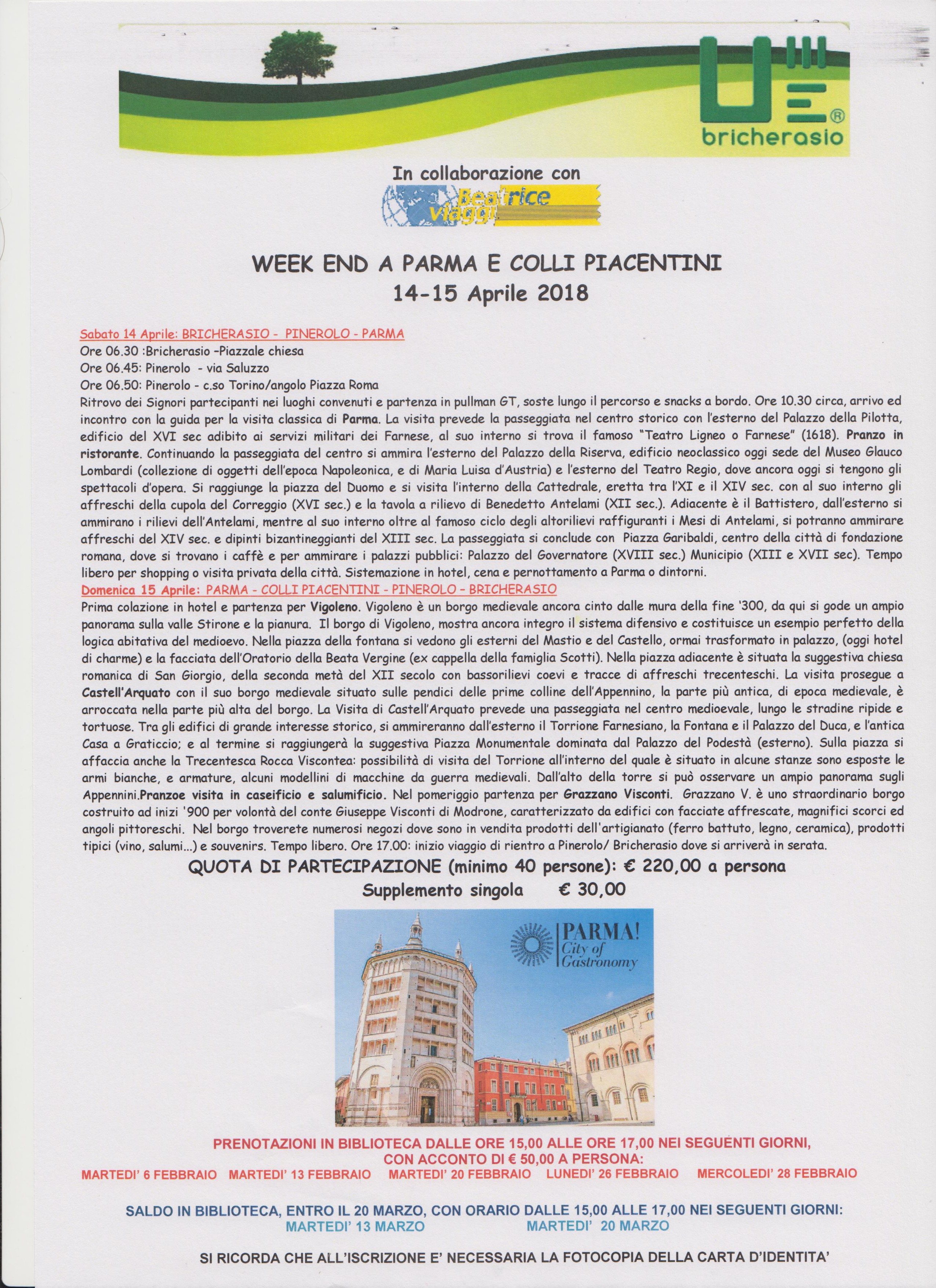 Sono ancora aperte mercoledì 28 febbraio dalle 15 alle 17 presso la biblioteca comunale di Bricherasio di Via Vittorio Emanuele 79/B le iscrizioni per partecipare alla gita sociale organizzata dall’Unitre di Bricherasio per soci e simpatizzanti, a Parma e colli piacentini per il weekend del 14-15 Aprile 2018 versando un acconto di € 50,00 a persona. Saldo in biblioteca il 13 e il 20 marzo. QUOTA DI PARTECIPAZIONE (minimo 40 persone): € 220,00 a persona. Il supplemento in camera singola costa € 30,00.