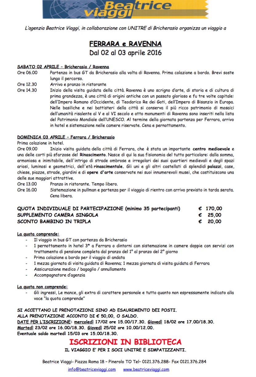 Sono ancora aperte martedì 15 marzo dalle 15,00 alle 18,30 presso la biblioteca comunale di Bricherasio di Via Vittorio Emanuele 79/B le iscrizioni per partecipare alla gita sociale organizzata dall’Unitre di Bricherasio per soci e simpatizzanti, a Ravenna e Ferrara prevista per sabato 2 e Domenica 3 aprile. Partenza da Piazza Santa Maria alle ore 6 con arrivo previsto per il pranzo.balle 14,30 inizio della visita guidata di Ravenna con i suoi battisteri e monumenti inseriti nella lista del Patrimonio Mondiale dell'Unesco e al termine della giornata partenza per Ferrara con arrivo e sistemazione in hotel per la cena ed il pernottamento. La Domenica dopo la colazione in hotel partenza per la visita con guida della città, importante centro medioevale ed una delle corti più sfarzose dell'età rinascimentale. Dopo il pranzo in ristorante delle 13 visita libera fino alle ore 16 per la sistemazione sul pullman per il rientro previsto in serata con cena libera. La quota di partecipazione è di 170,00 € da versare all'atto dell'iscrizione e comprende viaggio, pernottamento in hotel 3 stelle e l'accompagnatore.