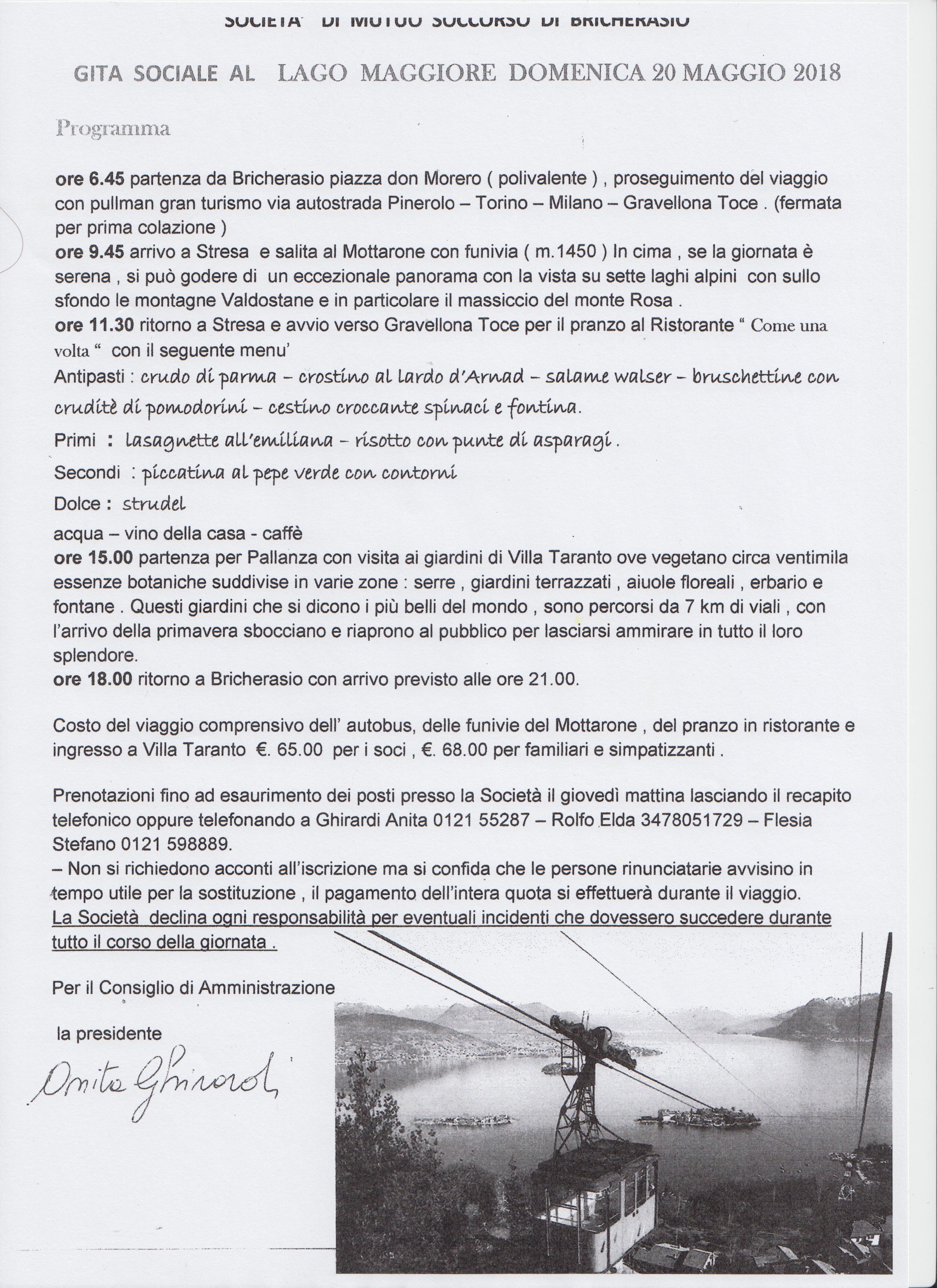 La Società di Mutuo Soccorso di Bricherasio organizza la gita sociale al Lago Maggiore per Domenica 20 maggio con partenza da Piazza Don Morero a Bricherasio previsto per le 6,45. Si visita Stresa in mattinata e dopo pranzo Villa Taranto a Pallanza dove si trovano circa ventimila essenze botaniche nello splendido giardino. Alle 18 ritorno a Bricherasio con arrivo previsto per le ore 21. Il costo del viaggio che comprende autobus, funivia del Mottarone, pranzo e ingresso a Villa Taranto è di 65 € per i soci e i 68 € per familiari e simpatizzanti. Prenotazioni fino ad esaurimento dei posti disponibili alla sede della Società bricherasiese in Via Brignone il giovedì mattina, dal Presidente Anita Ghirardi al numero 0121/55287, da Stefano Flesia 0121/598889 oppure da Elda Rolfo al 347/8051729.