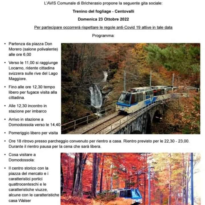 L'Avis di Bricherasio propone per Domenica 23 ottobre una gita sociale sul trenino del Foliage della Ferrovia Vigezzina Centovalli